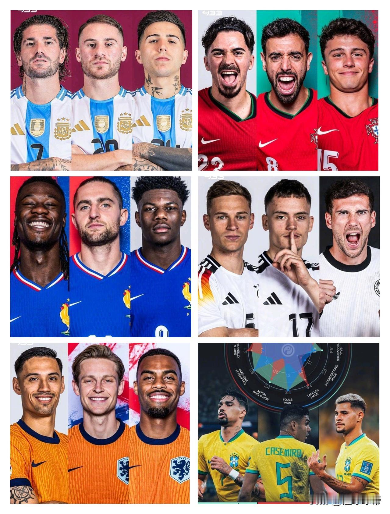 六大足球强国中场组合,谁才是天下第一? 阿根廷:德保罗、麦卡利斯特、恩佐 葡萄牙:维蒂尼亚、B费、内维斯 法国:卡马文加、拉比奥特、琼阿梅尼 德国:基米希、维尔茨、格雷茨卡 荷兰:赖因德斯、德容、赫拉芬贝赫 巴西:帕奎塔、卡塞米罗、吉马良斯 综合看来,葡萄牙最强,巴西最弱,葡萄牙迎来了中场黄金一代,可惜C罗却不在巅峰了,要不然世界杯冠军绝对属于葡萄牙了。
