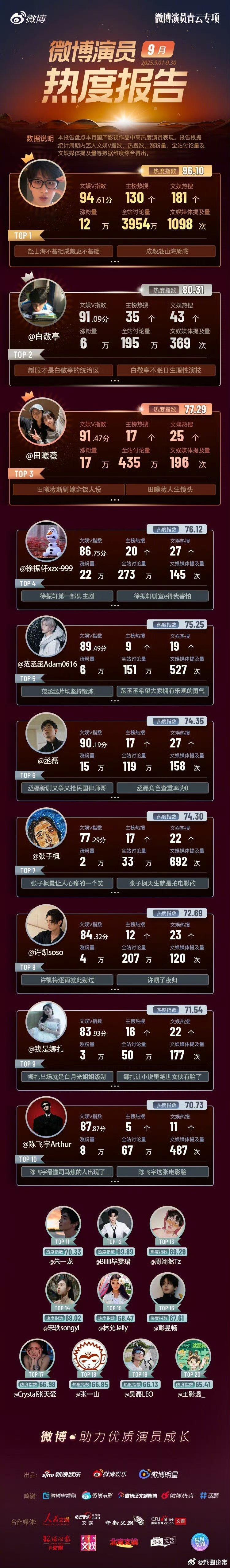 九月演员热度报告 九月演员热度报告出炉,成毅、白敬亭、田曦薇霸占前三甲,这阵容堪称“热度天花板”!成毅的古装剧自带爆款体质,白敬亭的现代剧人设深入人心,田曦薇的甜妹形象圈粉无数,每一位都是凭作品稳稳锁住热度!