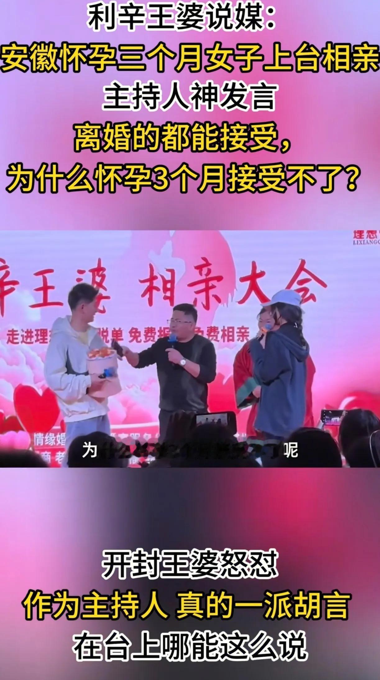 毫州王婆说媒节目真是离谱啊,纯纯没有下限。一怀孕三个月的女生竟然都能上台相亲,还表示想要找离前男友家近一点的对象[泪奔]。更离谱是毫州王婆还一直在撮合男生和怀孕女生,说啥男生要有担当,让男生不要介意这个问题。男生说接受不了,主持人的发言更是炸裂,说“离婚的都能接受,离婚不带孩子的都能接受,为啥怀孕的就接受不了”。见过戴绿帽的,没见过硬给别人找绿帽戴的。不知道主持人的的儿子多大了,既然不介意的话,可以介绍给自己的儿子,直接可以抱孙子了。相亲 婚姻