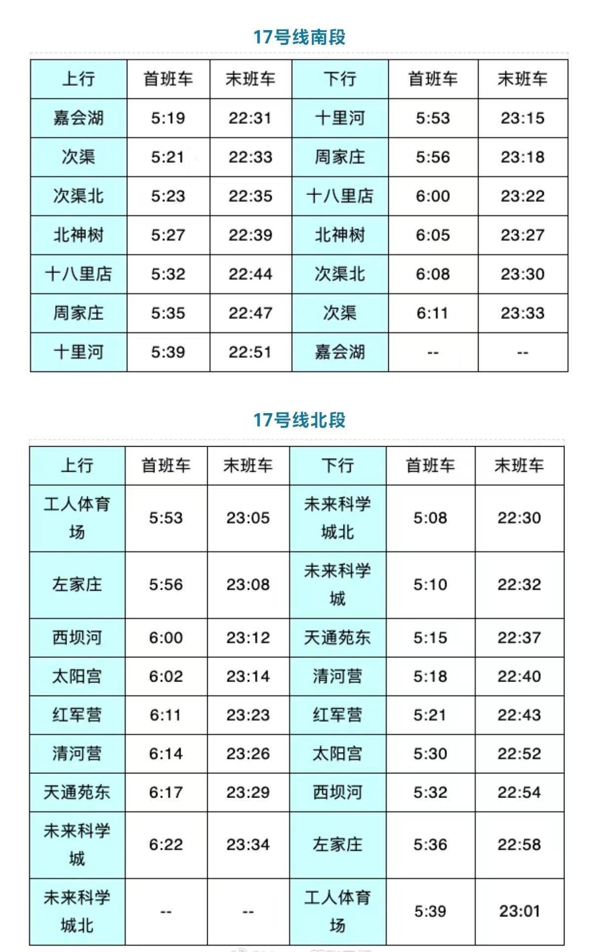 明天(2025 年 10 月 15 日)起,北京地铁 17 号线全线(嘉会湖站-未来科学城北站)将启动贯通按图试运行,期间,载客段为 17 号线既有段,即南段(嘉会湖站-十里河站)和北段(工人体育场站-未来科学城北站),非载客段为 17 号线中段(十里河站-工人体育场站)。同时,自贯通按图试运行起,17 号线既有段工作日晚高峰行车间隔及首末班车时间均有所调整,方便乘客出行。 17 号线贯通按图试运行期间,既有南段(嘉会湖站-十里河站)和北段(工人体育场站-未来科学城北站)工作日晚高峰行车间隔将由 8 分钟缩短至 6 分钟,早高峰行车间隔保持 6 分钟不变。 又一条南北贯通的东部地铁线路终于全线贯通了。 该线路由京港地铁运营。