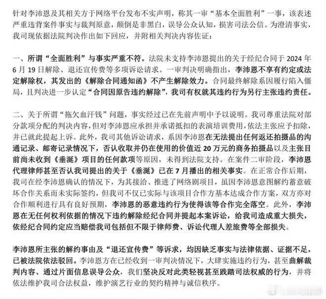 禾马娱乐回应弄简禾马娱乐称所谓全面胜利与事实严重不符 禾马娱乐回应弄简 :针对李沛恩及其相关方于网络平台发布不实声明,称其一审“基本全面胜利”一事,该表述严重违背案件事实与裁判原意,颠倒是非黑白,误导公众认知,损害司法公信。 弄简晒李沛恩解约案一审判决书