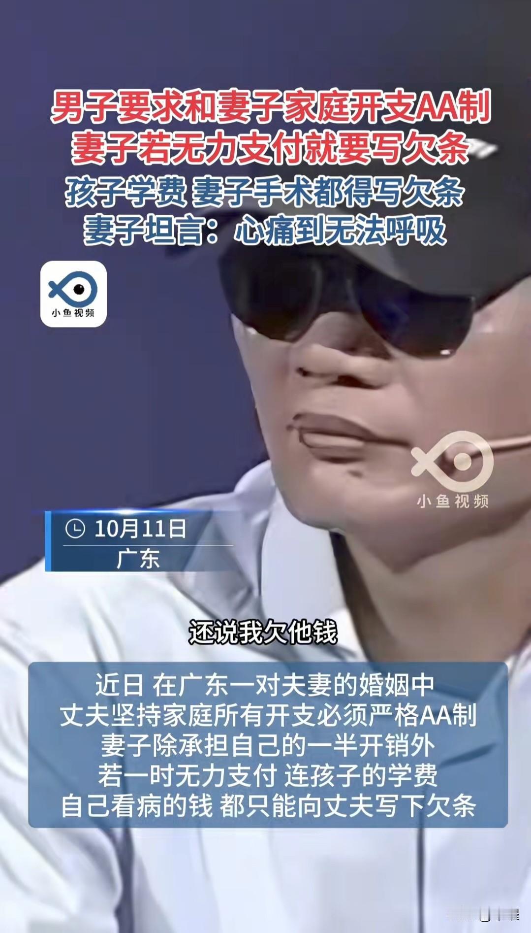 AA制到处都有。 家庭AA还是第一次听说。 丈夫坚持家庭所有开支严格AA制,妻子如果无力支付,需要给丈夫写欠条。孩子学费、自己手术的钱,都需要写。 有人说,AA制是现代婚姻的清醒。 有人说,这是把AA制当成了逃避责任的借口。 还有人说,是想离婚的前兆。 清醒不等于冷漠。 写的是金额,失去的却是信任与温情。 这样的婚姻到底带来了什么?