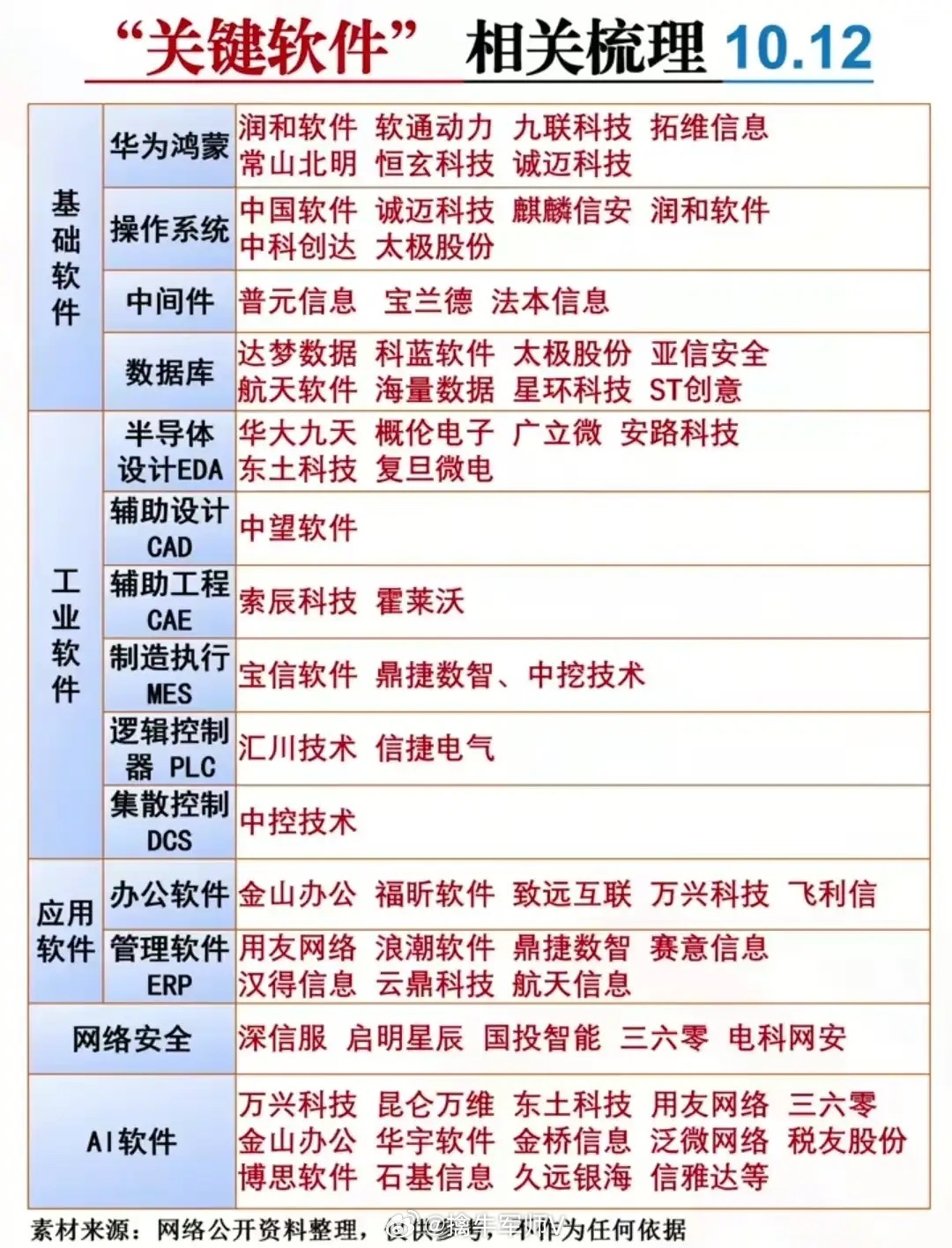 (2)国产软件概念:10月10日特朗普宣布对所有关键软件实施出口管制。这使得软件国产化替代的紧迫性进一步凸显,有望加速国产操作系统、工业软件等领域的国产化进程。国产软件核心龙头代表有中国软件、软通动力、金山办公、华大九天等等。