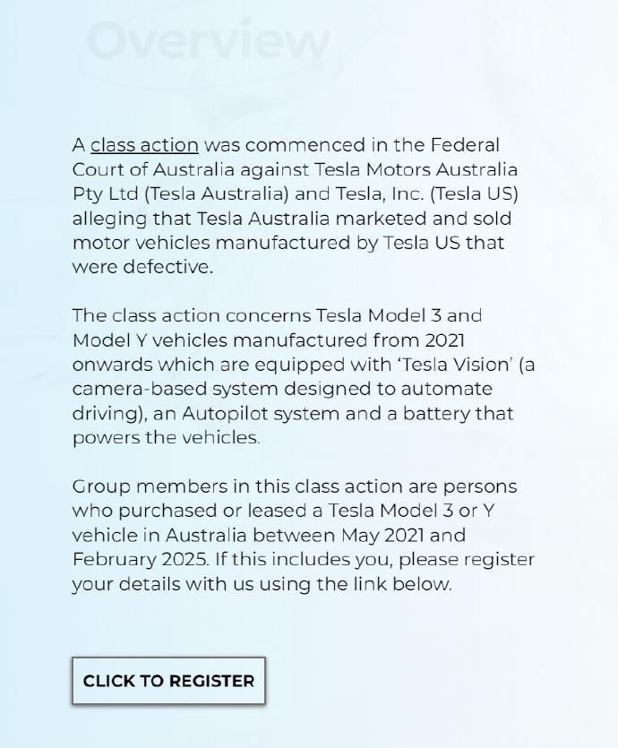 据媒体报道,特斯拉在澳大利亚也迎来了集体诉讼,核心诉讼点:幽灵刹车、续航虚标、夸大宣传自动驾驶。 本次诉讼涉及2021年5月之后生产制造的特斯拉Model Y和Model 3车型,由多家律所合作发起,采用no win, no pay的方式,赢了再付钱,不赢不要钱,目前已经在teslaaction网站上征集到了数千名特斯拉车主参与集体诉讼。 要是澳洲这个官司特斯拉输了,不知道会不会对中国、欧洲、美国这些地区的特斯拉FSD诉讼案子产生连锁影响。