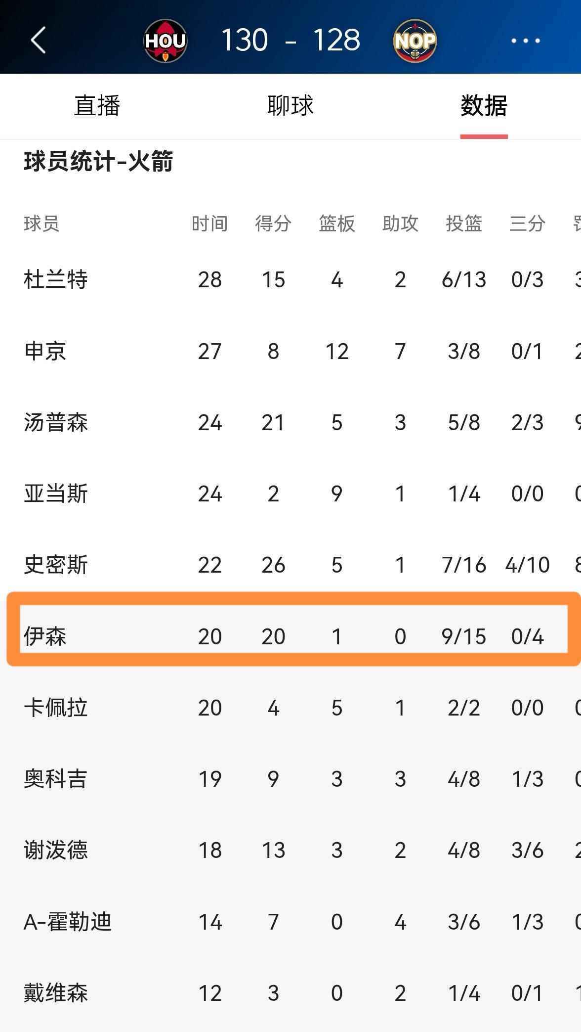 火箭新星伊森终于扬眉吐气了!在今天火箭客场以130:128力克鹈鹕的季前赛中,伊森不负众望打出了非常惊艳的表现。 整场比赛下来,伊森替补出战20分钟,投篮15中9,其中罚球3中2得到20分1篮板2抢断1盖帽。 当伊森专注于得分和防守时,他就能在攻防两端为球队提供非常大的帮助,伊森已经成为了火箭替补阵容的第一核心。