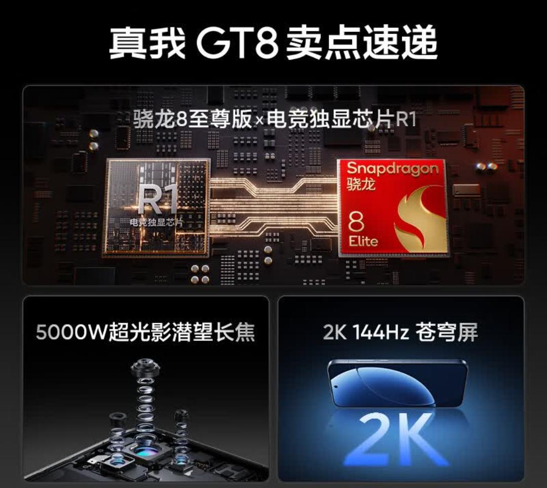 真我经典节目再现,真我GT8配置被京东曝光。 真我GT8标准版同样有Pro的2K分辨率 144Hz刷新率直屏,骁龙8至尊版处理器、独显芯片、金属中框,5000万超光影潜望长焦。
