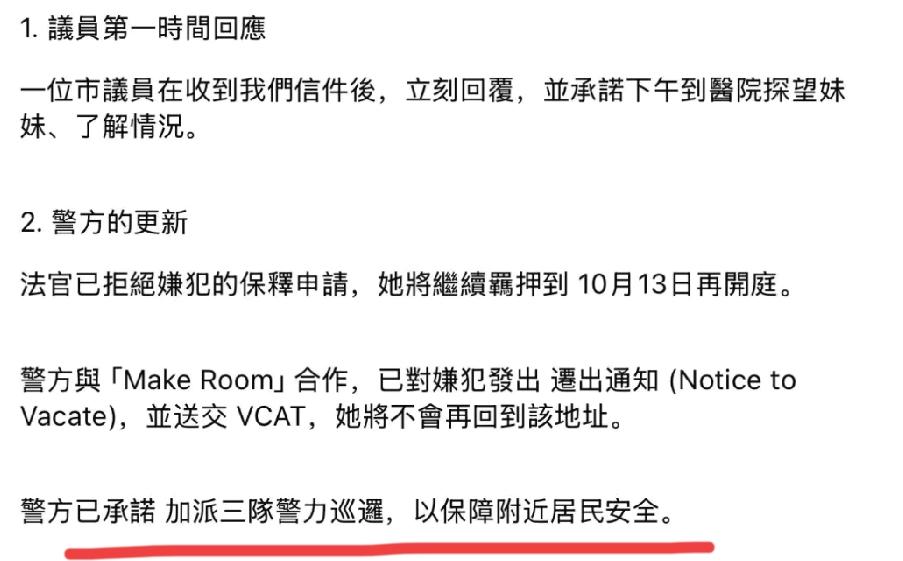 当地时间10月2号早上7点半,墨尔本一华人女子上班途中,遭另一女子袭击。 前后只有数秒时间,嫌犯跑过来在看过她的脸后用弹簧dao扎入她的右胸,然后逃跑。 袭击她的女人来自不远处的收容所,那里是政府建的公屋,专门收留无家可归或瘾君子。 家属称只这一下就造成被袭者气血胸(肺塌陷),幸亏当时有路人出手帮忙按压伤口,现在人还在医院救治。 目前嫌犯已经被捕并拒绝保释,当地网友好心提醒,在那边走路遇到这种收容所,最好绕道。