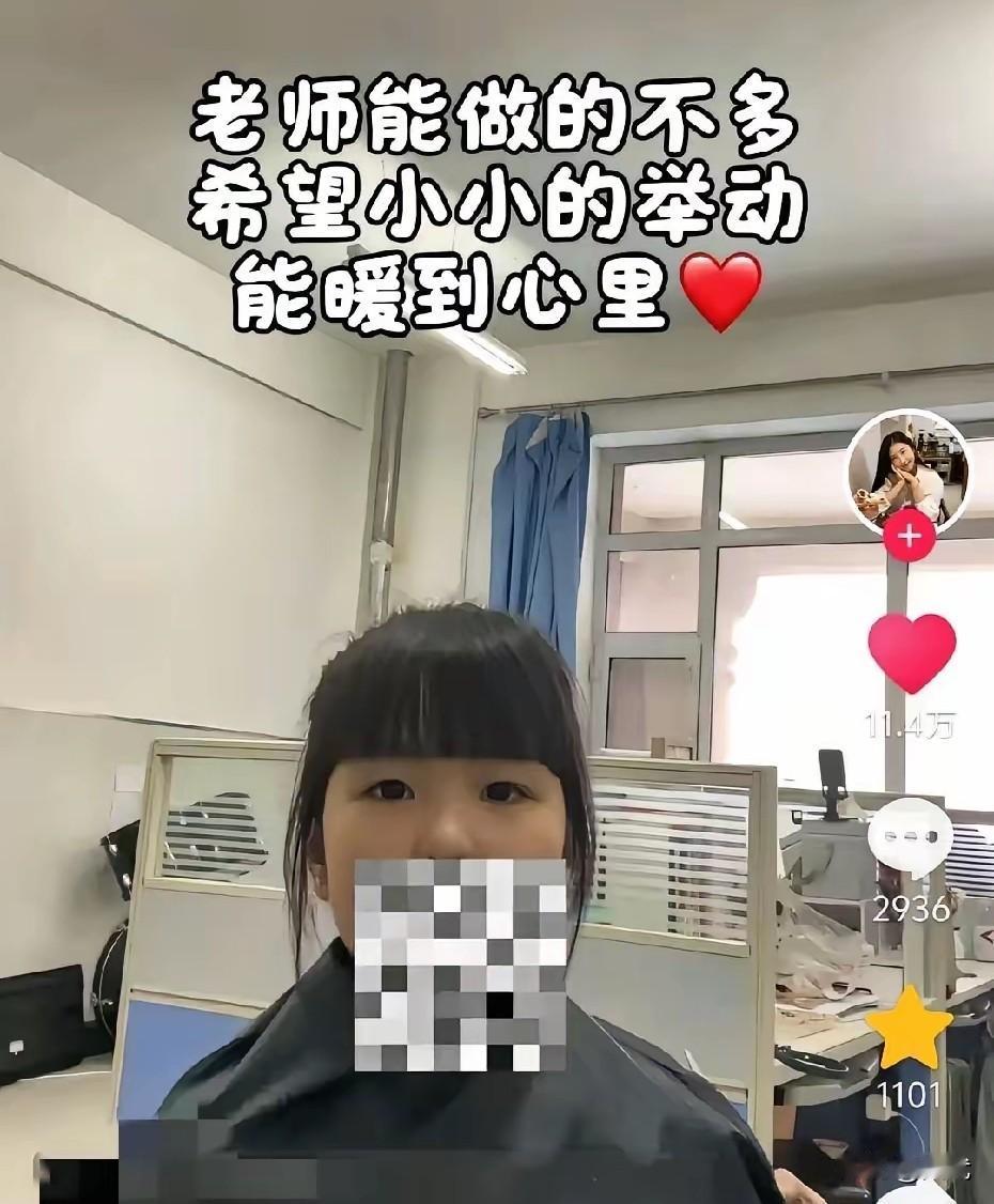 黑龙江,一位女老师无意间发现,班里一个小女孩总被刘海遮住眼睛。一句“回家让妈妈剪剪吧”,却换来孩子低声的回应:“爸爸下班时理发店都关门了……”老师的心被揪住了。她没有追问破碎的家庭,而是蹲下身,用一把手工剪刀和一句“我剪的比理发店叔叔还好”,为孩子筑起了一座小小的尊严堡垒。 这场剪发没有悲情渲染。老师以“给姐姐剪刘海”为借口,既解决了孩子的实际困难,又巧妙避开了敏感话题。小女孩比划着“剪到眉毛上边”时,那种过早的懂事让老师瞬间泪目——她不是不知道“剪短一点能挨得久些”,而是习惯了在生活的缝隙里自己寻找答案。而老师用最朴实的行动告诉她:你的烦恼,值得被认真对待。 更动人的是细节里的分寸感。老师没有用“单亲家庭”的标签定义孩子,而是夸她“爸爸养得好”,把“帮助”包装成一次普通的互动。这种不越界的善良,恰恰是对孩子自尊心最温柔的守护。教育的光辉,往往就藏在这些“小事”里:当老师俯身剪发时,她传递的不仅是整齐的刘海,更是一种信念——你的存在本身,就值得被细心呵护。 视频里,小女孩蹦跳回教室的背影,或许比任何教科书都更生动地诠释了教育的真谛:它不仅是知识的传递,更是心灵的托举。那把普通的手工剪刀,剪断的是刘海,连起的却是孩子对世界的信任。多年后,她或许会忘记那天的音乐课,但一定会记得:曾有一位老师,用剪刀为她挑开了一束光。