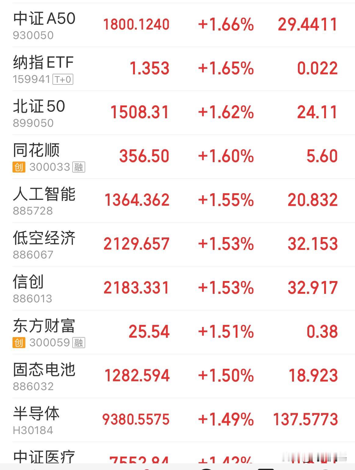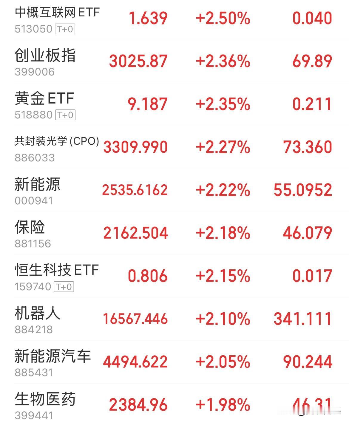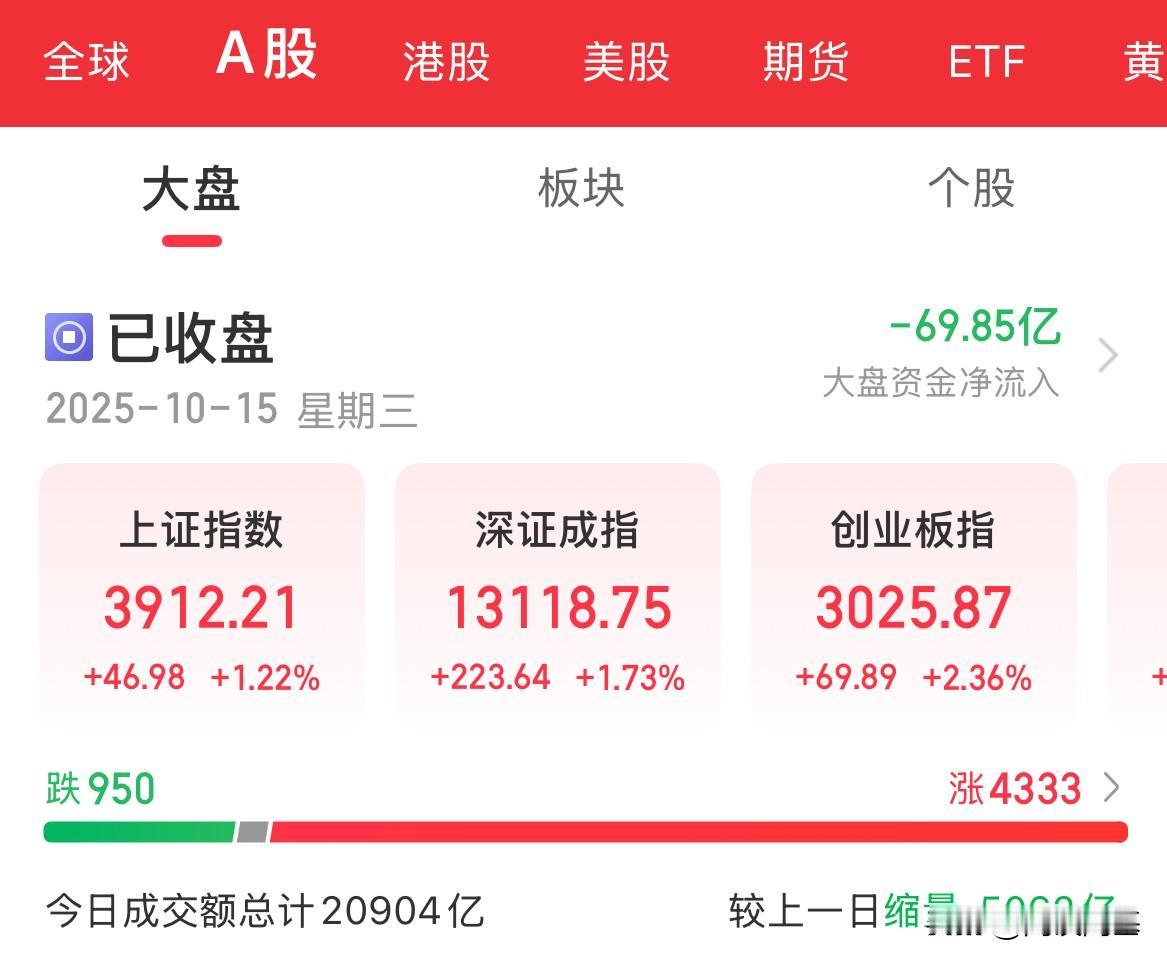 收盘:2.09万亿元,全都涨了,A股涨了,港股涨了,现货黄金大涨突破4200美元,白银涨,人民币走高 连续三天的调整,盘面终于迎来了反弹,指数高开高走,指数午后全线拉升,资金选择观望,全天成交额大幅缩量5000亿,成交额2.09万亿,指数午后拉升, 上证涨幅1.22%,深证涨幅1.73%,创业板涨幅2.36%,上证重回3900点之上,创业板重回3000点之上,两市涨幅超4300家, 热门板块几乎普涨,CPO,机器人、生物医药涨幅居前,半导体午后探底回升,新能源汽车涨幅超2%, A50午后拉升涨幅1.83%,美元指数走弱,人民币走高,涨幅0.17%,报7.12778, 现货黄金、白银延续强势的走势,几乎是盘中完成调整后继续拉升,现货黄金历史首次突破4200美元/盎司,现货白银涨幅1.31%,报52.621美元/盎司, 美股盘前小幅上涨,道指涨幅0.24%,纳指涨幅0.51%,标普500指数涨幅0.39%。