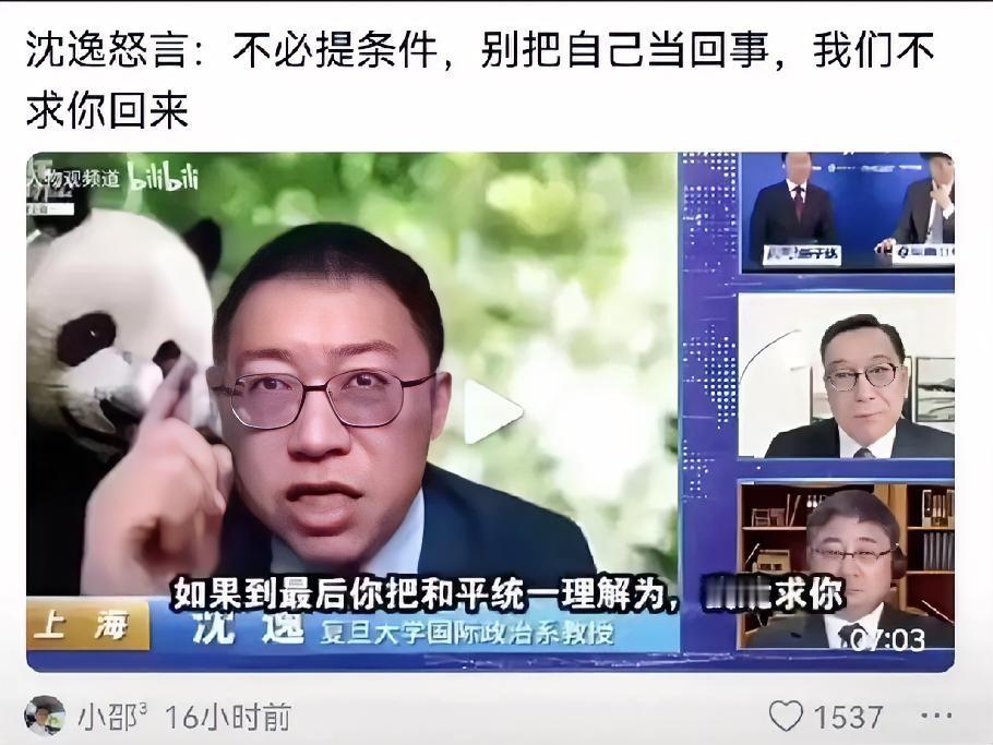 沈逸教授怒言警告台湾某些人,不必提条件,别太把自己当回事了,我们不会跪求你们回来