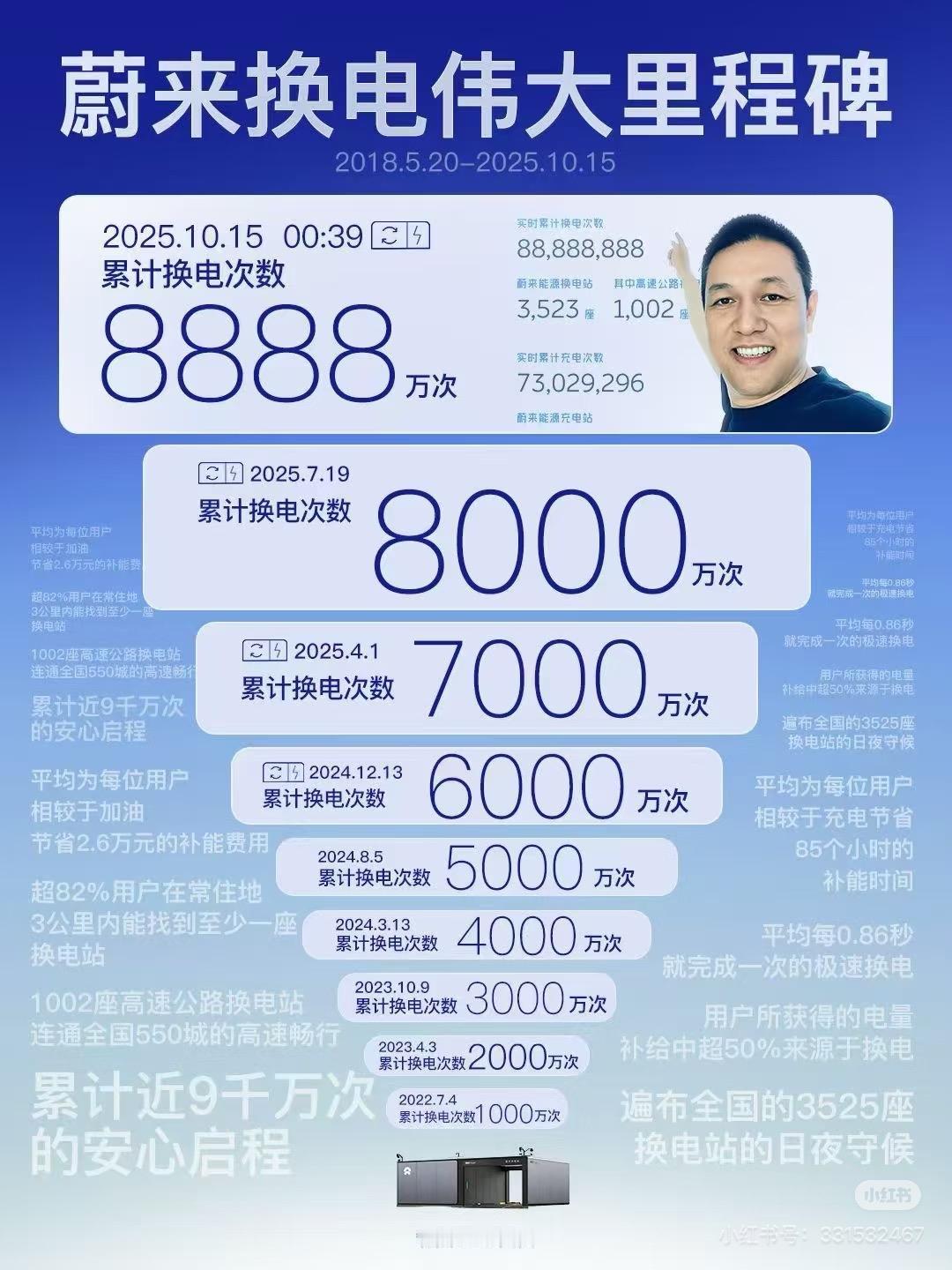 8888万次! 节假日的时候,蔚来的换电模式绝对是新能源汽车品牌里最方便的存在 因为蔚来的换电站不会有其他品牌的车占用换电设备,这个很重要,现在你不管去哪个高速服务区,不同品牌车型胡乱停放,共用一个充电桩等等,如果你是一个购买了高端新能源汽车的用户肯定不愿意去和别人抢占充电桩,所以说换电绝对是当下最快速的充电方式