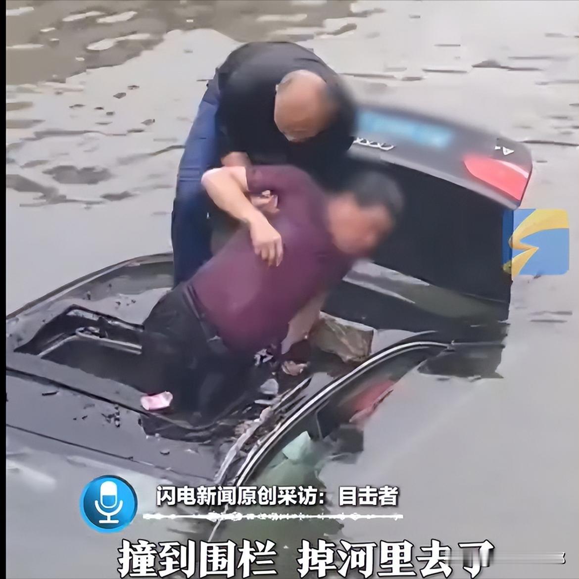 命真大! 江苏泰州一奥迪车主为紧急避让突然闯红灯的电动车, 猛打方向盘。 结果车子失控,冲断护栏,一头扎进路边的河里。 好在当时,一名退伍军人带着家人路过。 看着车子往下沉,这名退伍军人安顿好家人后,然后立即跳入水中开始救援。 两边的窗子已经沉入水中,水压太大,根本砸不开。 还是军人反应快,立即用砖块不停地砸车顶的天窗,手臂被玻璃划伤了都没停下来。 这时,一名特警也看到了,二话不说,跳到水里,一起救人。 两人合力,才把车主拖到岸边。 司机被救出的时候,意识已经模糊,人也虚脱,几乎是昏迷状态。 要是再晚个1分钟,可能就没命了。 等车主醒了,真得好好谢谢两个大好人。 这种情况下, 大家觉得那个闯红灯的老大妈该负什么样的责任呢?