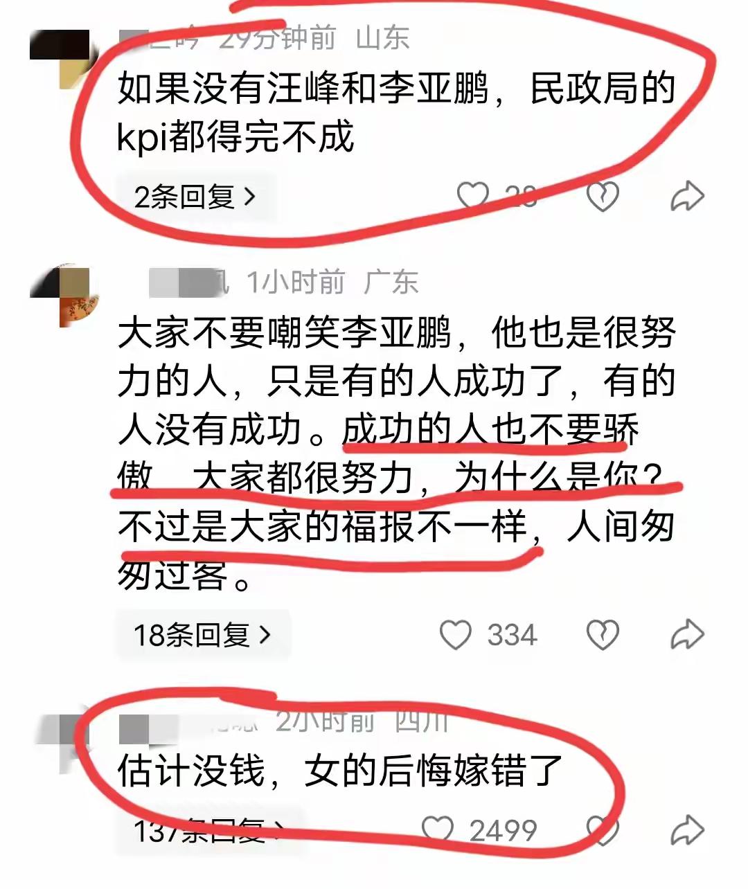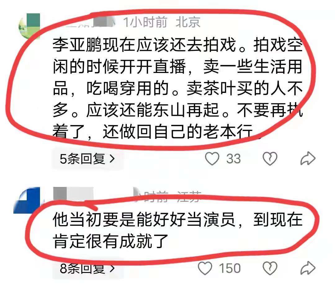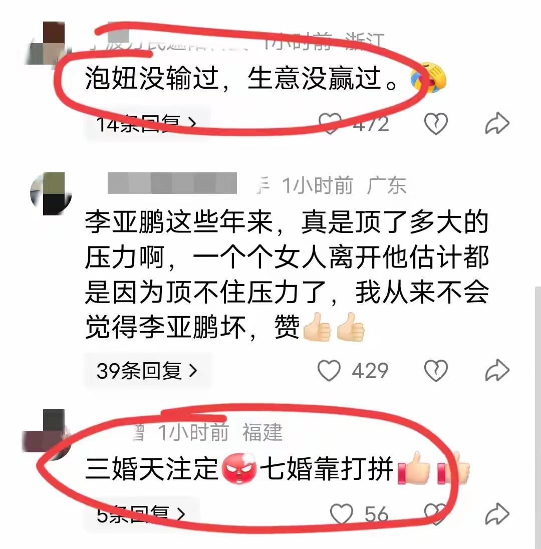 大家真的不要再嘲笑李亚鹏了 这届网友真的太有才了,就没有他们玩不了的梗,差点出不来评论区,真的是让人哭笑不得! 有劝李亚鹏的,说他现在应该放弃执念。重操旧业回去拍戏,同时直播带货,也不要卖茶叶了,卖一些生活用品,吃喝穿用的! 还有调侃他的,说他和汪峰是民政局的VIP,什么“三婚天注定,七婚靠打拼”。 更有说他:泡妞没输过,生意没赢过。这个好像也有点道理,当年多少天后,美女他都交往过,现在创了这么多业好像也都没啥大起色。 还有说金喜是因为他没钱了,嫁错了! 也有网友觉得该支持他,成功对他来说只是迟到了而已,他是一个很努力的人。 看完才知道,作为一个公众人物,评论区真的能感受到啥样评价都有,褒贬不一,没有一颗大心脏真的可能接受不了。 不管怎么说吧,李亚鹏确实风光过,现在也确实窘迫,不过他至少做过好多公益,这一点不可否定。婚姻这点上,我觉得确实有点可惜,两个人都是很正能量的,只是有了孩子后,可能想要的不一样而已,也没有谁对谁错。 这可能就是人生啊,哪有那么多一帆风顺,都是自己在负重前行,加油努力吧!