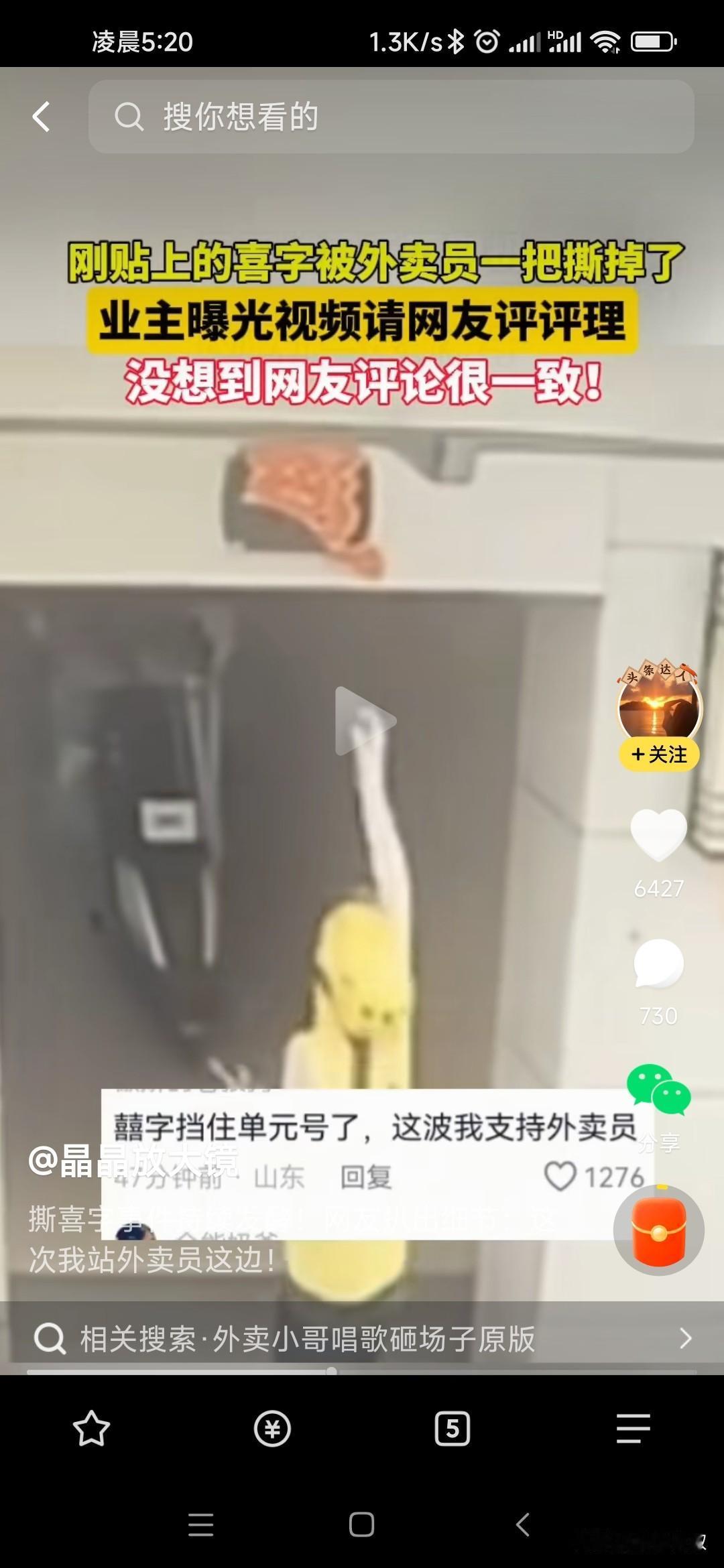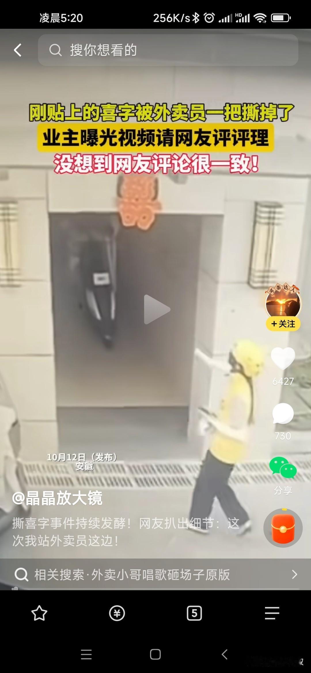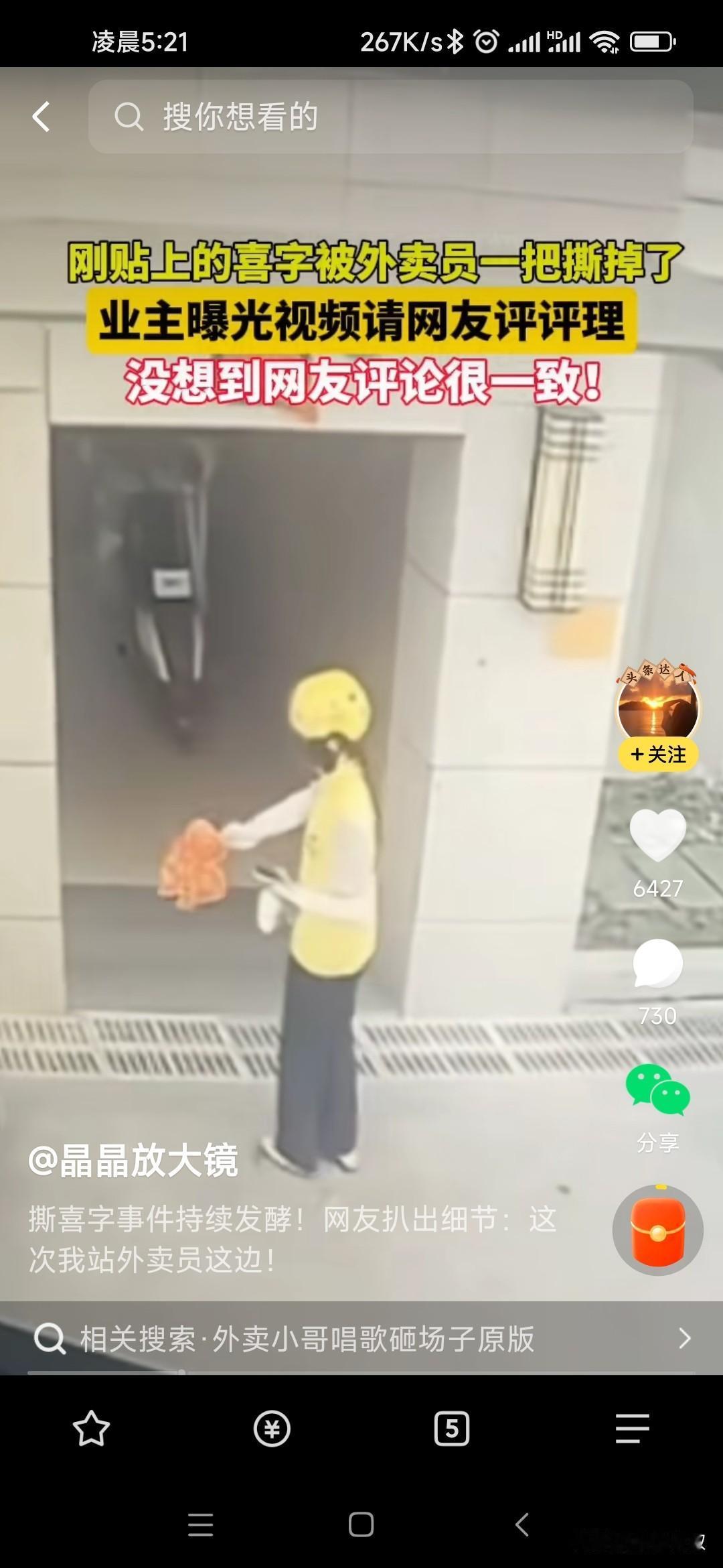 人家大喜的日子洞房花烛夜,外卖员便把人家大红的喜字撕下来。这让让谁都接受不了,更让让新郎大为不爽,新郎觉得晦气,于是把视频发到网上让大家评评理。刚一开始看视频开头,茅头便指向了外卖员,遭大家大家一致谴责,低素质,活该送外卖,差评,举报到公司……等等等。 没想到5秒以后,事件反转了。 大家反而又都站队外卖员…… 大家觉得谁有理呢?