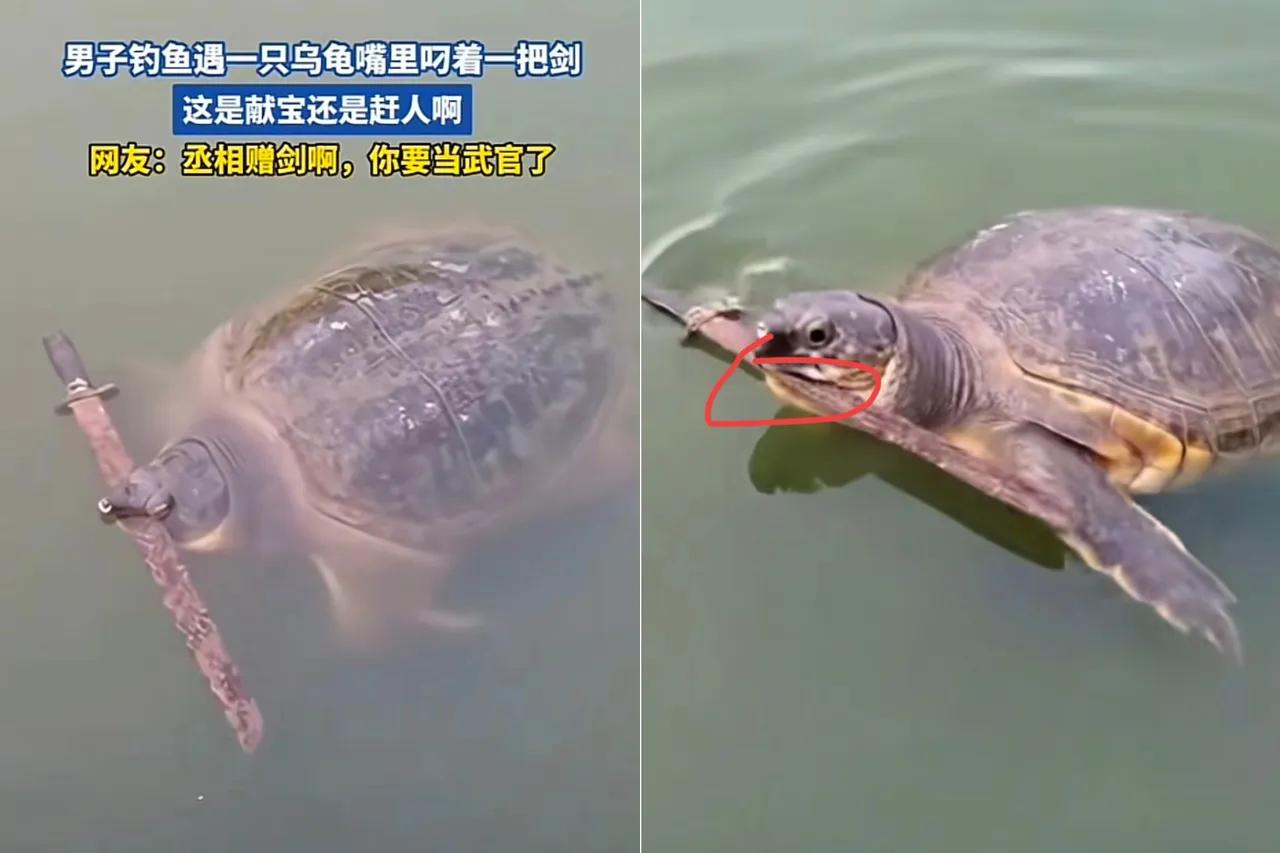 广东一男子钓鱼时, 甲鱼主动送上门, 他还以为自己运气好,准备抄网时却 发现甲鱼口中居然叼着一把短剑! 看着有些年头了,壳比他手掌还大一圈,壳上深褐色的纹路跟地图似的。 嘴叼着个细长玩意儿,阳光一照,还泛着点金属光! 等甲鱼游到离岸边一米来远,才看明白是把小短剑,大概十厘米长! 剑身是金属的,上面锈迹斑斑,剑柄都快看不清了。 要是你钓到这么个带剑的甲鱼,会怎么处理呢? 网友评论: 乌龟:一百年前你丢的剑,我等了你一百年,终于还给你,你是这把剑的主人,剑人! 假如是我,我肯定接宝剑过来看看。假如是古物,带回家把赏。 龟是灵物,一眼就看穿你的前世:曾记否?这剑是当年是你乘船时掉的,你还在船上刻你掉剑的位置来的? 裙边都没有的甲鱼?甲鱼和乌龟很容易区分,就看裙边啊。这个都是整块乌龟壳。 很多年前有部电影,是乌龟衔着一张藏宝图,后来在沙漠里寻宝,电影名字忘记了,八十年代的。 河里甲鱼 农村甲鱼 海鲜甲鱼 江西甲鱼 野生中华甲鱼 甲鱼钓鱼 徒手钓甲鱼