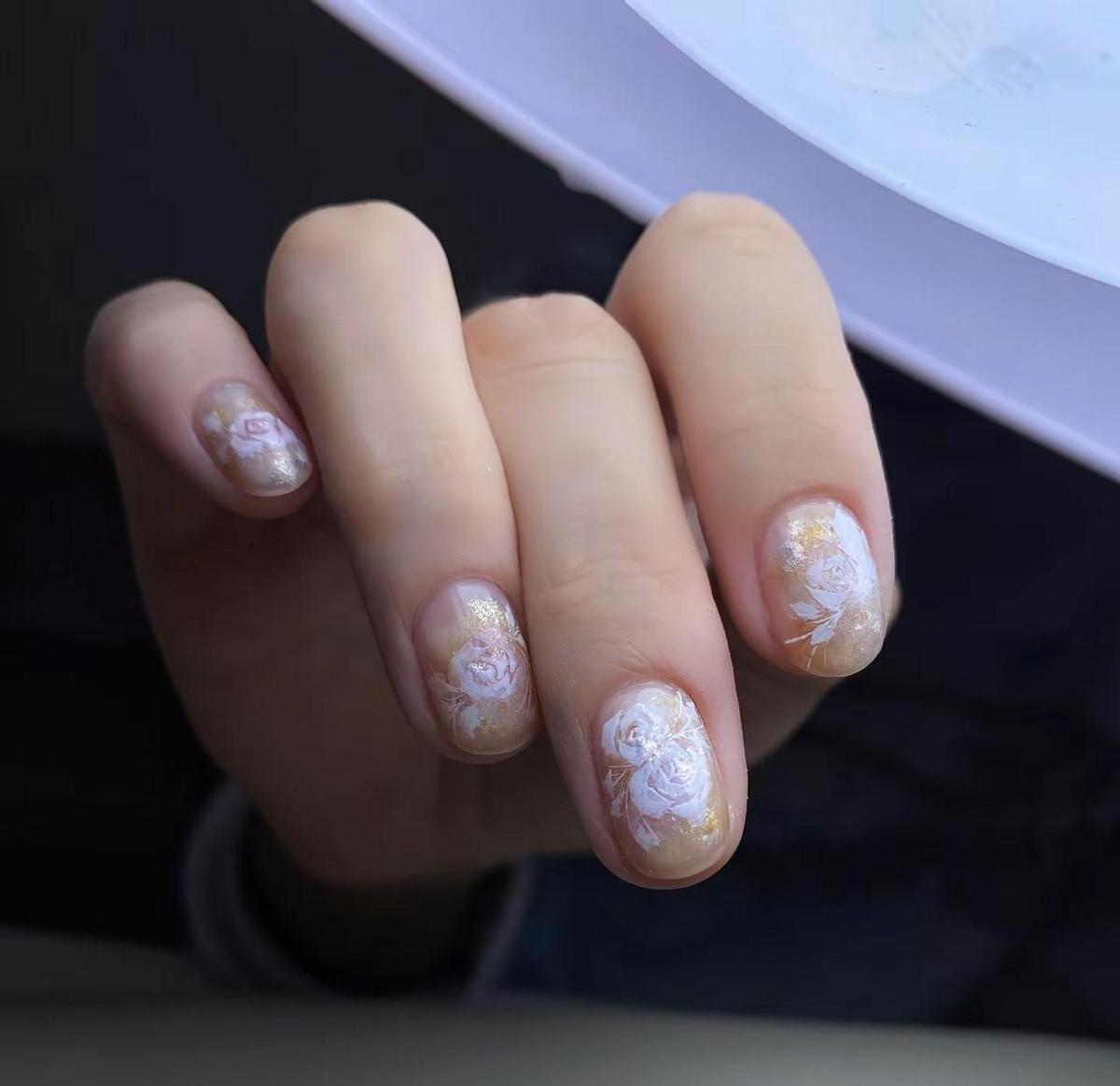 蛋花汤美甲,不是吐槽,是真香。 奶白打底,淡黄晕开,玫瑰色像撒了把花瓣进去,不浓
