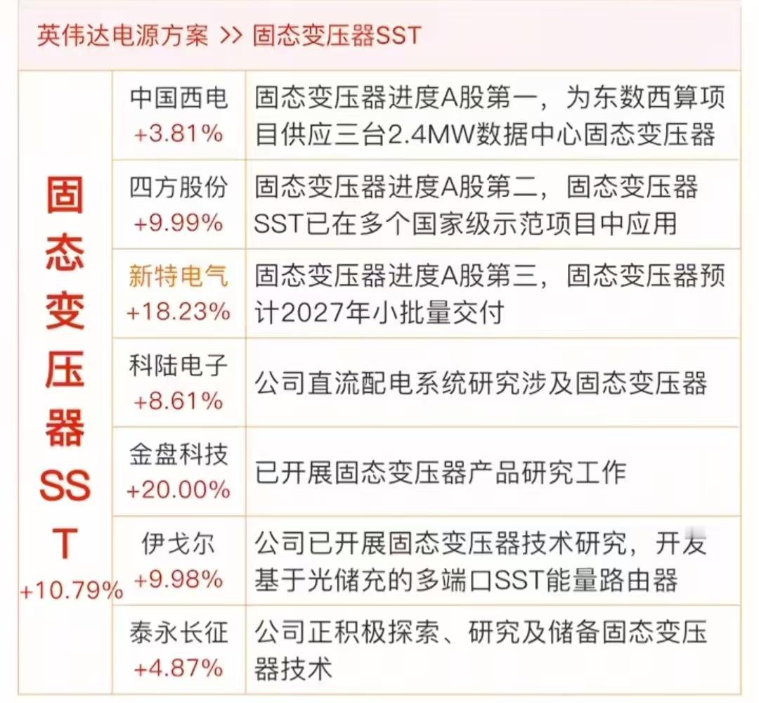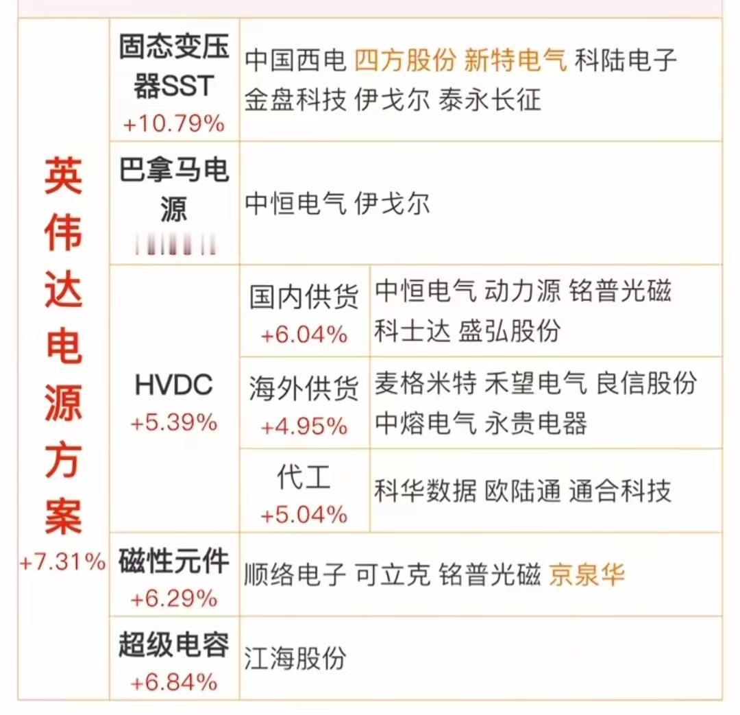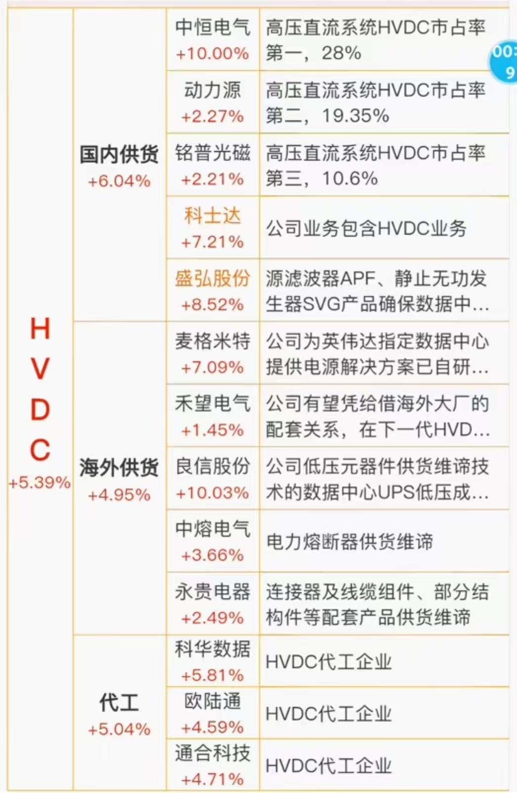 科技新题材!在OCP Global Summit 2025上英伟达正式发布面向未来AI数据中心的800V高压直流电源架构,揭示“AI Factor”愿景,相关概念涨幅达7.31%。英伟达电源方案题材包括固态变压器概念、巴拿马电源概念、HVDC概念、超级电容概念等等。 HVDC是“High Voltage Direct Current ”的缩写,中文名称是高压直流输电 。国内HDC行业龙头代表有中恒电气、科士达、盛弘股份,行业代工龙头有科华数据、欧陆通等等。 超级电容概念龙头代表:江海股份 理财有风险入市需谨慎,资料取材网络仅供参考!