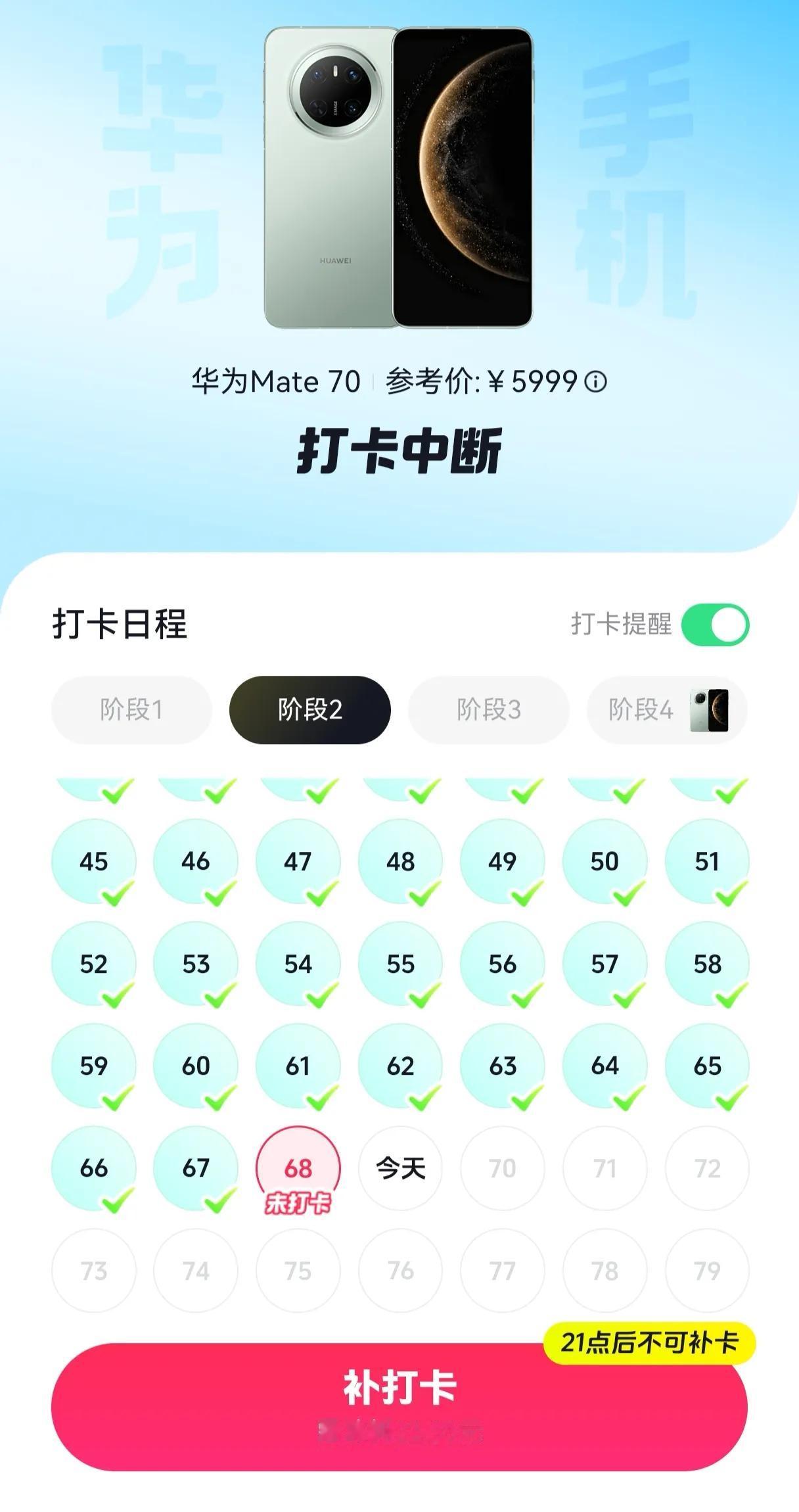 打卡拿手机就是骗局,突然某一天会告诉你打卡中断,我都是上午完成打卡,有闹钟,昨天没截图,然后今天上午就显示中断了,前几天另一个打卡号一样一样的套路! 字节也开始学习某多了!