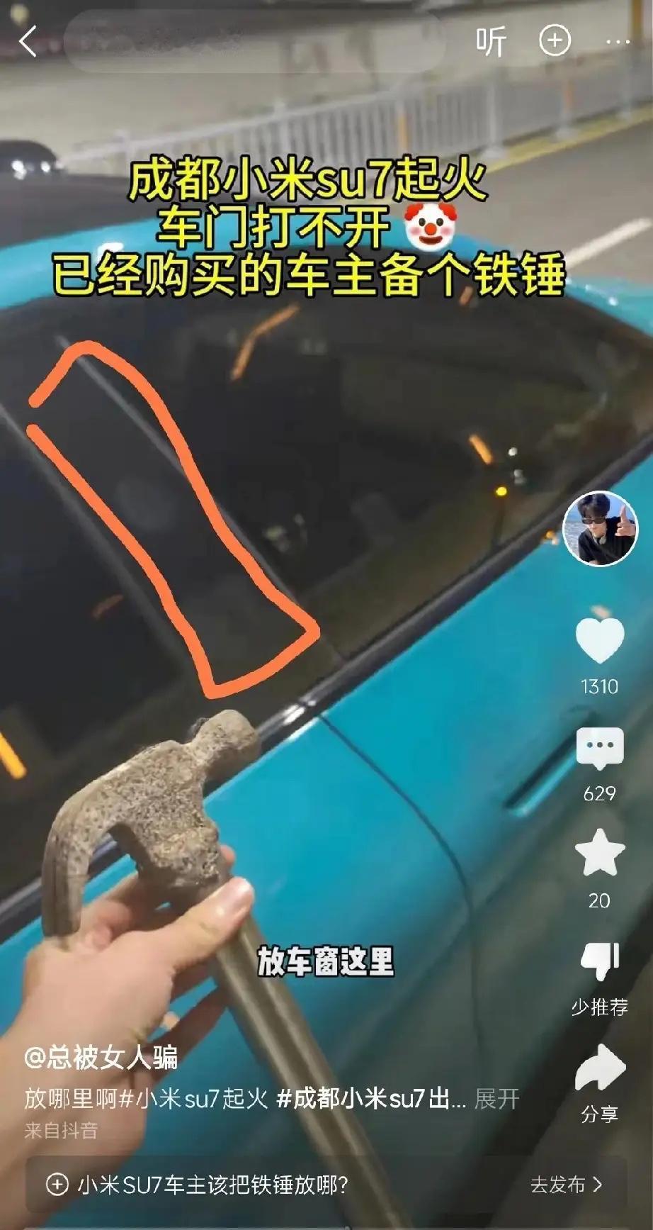 成都小米SU7事故中,因打不开车门砸不破车窗而错失救援时机。有车主就开始担心了,于是就想着买把榔头放在车上,以便万一出现事故 网友表示:这把榔头应该想办法放在车外面的!你看看这次人是从外面砸车窗的!榔头必需放车外的!车内的人已经晕晕的!砸个鸟呢![大笑][大笑][大笑][大笑][大笑][大笑] 最好的方案是把所有的车型电动门锁都改成原来的内外都可以拉开的机械门锁,并取消行驶中自动落锁功能 所有车速度超过20km都会自动落锁。不在车里手动解锁的话,外面是无法打开。这个就要研究研究这个问题了。 应该设计和战斗机跳伞一样的功能,当车辆发生碰撞时。后台系统或人工一键启爆,四门炸开,逃生机率提高98.88%。 大家怎么看?