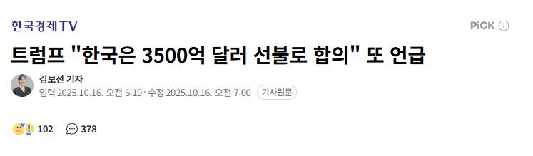 美国总统唐纳德·特朗普一再声称,韩国作为与美国贸易协议的一部分,已同意向美国预先支付3500亿美元(约合500万亿韩元)的投资资金。