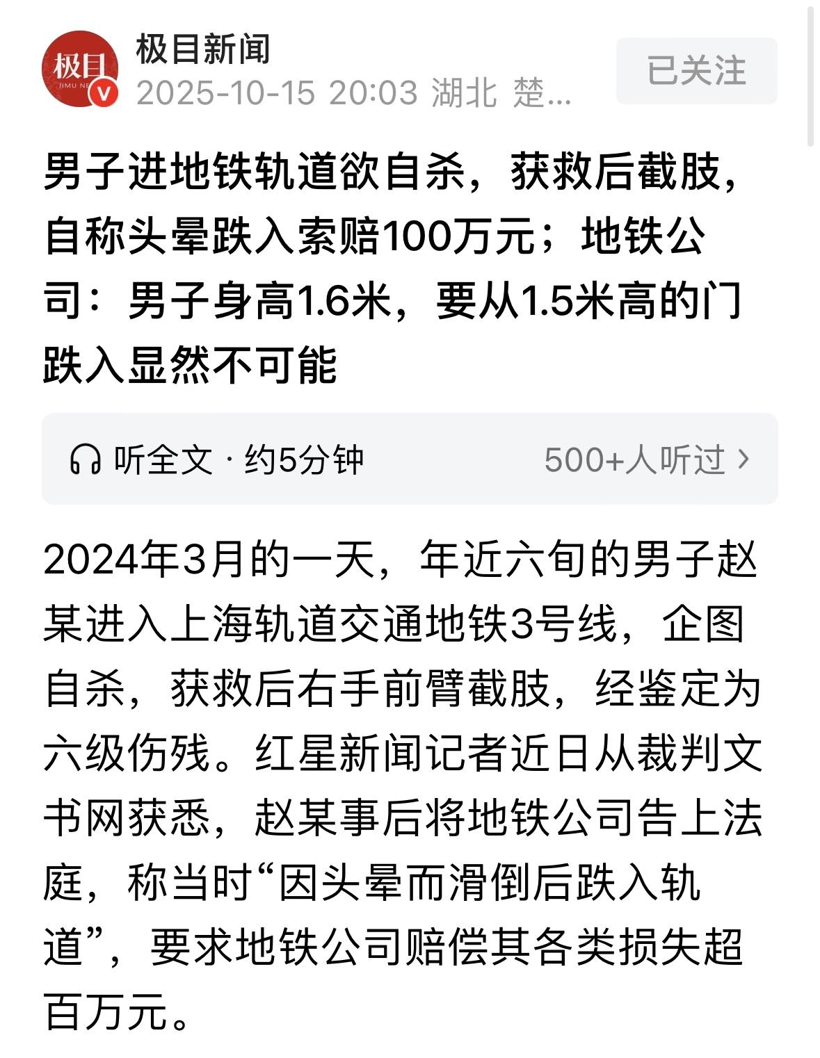 上海,57岁男子赶在地铁即将进站前,突然翻过站台屏蔽门,躺在轨道中央轻生,工作人员发现后立马按下紧急关闭按钮,并通知控车室,救了男子一命,可男子还是因遭到碾压失去一条胳膊,万万没想到,事后男子看自己轻生不成反倒落下残疾,就干脆把地铁公司告上法庭,说自己当时是因为头晕,意外跌进轨道的,地铁公司没有尽到安全保障义务,得赔他各项损失共100万。法院判了! 2024年3月的一个晚上,上海地铁3号线灯光通明。57岁的赵某刷手机进站后,独自徘徊在站台边缘。 监控录像显示,这个身高1米6的中年男子,竟赶在列车进站前,突然翻越1.5米高的站台隔离屏障,消失在了轨道深处。 这一幕,恰好被站台对面的女乘客看到,就在列车呼啸而过时,她尖叫着大喊了一句:轨道里有人! 站务员听见后连忙冲上前按下紧急制动按钮,值班站长接到消息后带着3名工作人员赶来,他们跳下轨道,在列车轮下拖出血肉模糊,但尚有一丝气息的赵某。 这时大家定睛一看,发现赵某的一条胳膊已经没了。 救护车赶到后,地铁员工跟在救护车送后面去送赵某的断肢,只可惜医生最终摇头表示,接不回去了。 重症监护室里,赵某艰难吐出的话语令人心酸,他说,你们不该救我... 当民警追问事情经过,他颓然承认,说自己想死。 病房外,他女婿正向警方解释称,岳父最近因为丢了工作,整夜睡不着觉,可能因为压力太大才会做出这种举动。 让地铁公司万万没想到的是,3个月后,装上假肢的赵某突然将他们告上法庭。 在赔偿请求书中,赵某表示,自己当时是突然头晕滑倒跌进轨道的,并非有意寻死,如今他落下六级伤残,他觉得地铁公司未尽到安全保障义务,所以索赔医疗费、伤残补助等共计100万元。 但赵某忘记了一点,警方的询问笔录里还留着他亲口说出的"想卧轨寻死"的记录。 法庭上,两方对薄公堂,地铁公司当庭播放监控还原了当时的真相。 事发当日19点43分,赵某在站台徘徊7分钟后,突然双手扒住玻璃屏障顶端,右腿发力翻越屏障。 安全主管现场演示,说赵某1.6米的身高,如果想意外跌落,除非先爬上半米高的设备箱再滚下去。 更关键的是,赵某被发现时正平躺在轨道正中央,这绝不可能是在边缘滑倒坠落的姿态。 值班站长表示,事发后我们的人第一时间按下紧急制动,10秒断电、5分钟救人、20分钟内送上救护车,已经尽到了救助义务。 而根据当时的急救记录,诊断书上写得很清楚,赵某除了右臂撕裂伤,其他部位没有问题。 法官翻看病历时注意到一个关键细节,那就是赵某被救起意识清醒。医护人员记载:患者自诉无头晕头痛,无胸腹疼痛。 这明显和赵某突发头晕坠轨的主张形成矛盾。 有人认为,乘客只要是购票进站,运营方就得为他的安全负责,即使他自残也是现场工作人员监管不力。 也有人非常不认可这个观点,说这种诬告没有任何成本,所以现在不管有理没理,都要到法院去薅一耙子! 对于这种人不仅要驳回全部诉讼请求,还应以敲诈勒索罪判处他刑罚。这样的恶人太多了,就是因为对他们太宽容,太放任了,所以才把坏人养的越来越多了。 这种该提起公诉,不能让他全身而退。 那么,从法律角度,怎么看待赵某和地铁公司的这场官司? 《民法典》第1174条规定:损害是因受害人故意造成的,行为人不承担责任。法律另有规定的,依照其规定。 赵某的六级伤残直接源于他主动翻越1.5米高站台屏蔽门、选择卧轨自杀的行为。 根据法院查明的事实,赵某在警方询问中反复强调“不要救我”“到火车站想卧轨自杀”,女婿报警时也明确他“因工作不顺有轻生念头”。 其次,1.6米身高的赵某无法通过“滑倒”意外跌入轨行区,且受伤时平躺于轨道中央的姿态与自杀行为高度吻合,排除意外可能性。 最后,监控显示站台设有物理隔离屏障,工作人员在乘客提醒后3分钟内启动紧急制动,20分钟内完成救援送医,全程符合,并远超安全保障义务标准。 当损害结果完全由受害人自身故意行为导致时,无论公共场所管理者是否尽到 安全保障义务,都不用承担民事责任。 地铁公司已经通过物理隔离、监控覆盖、应急流程构建了“三重防护网”,但无法预防、更无法阻止赵某主动实施自杀行为。 法院据此认定,赵某的故意自陷风险行为切断了地铁公司的责任链条,符合“受害人故意免责”的法定情形。 法律保护生命权,但尊重个体选择;当个人选择以极端方式结束生命时,其损害后果应由行为人自行承担,而非转嫁给公共资源承担者。 最终,法院驳回了赵某的全部诉讼请求。 对此,你怎么看? 关注@运良说法 学法律知识不迷路