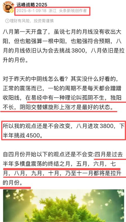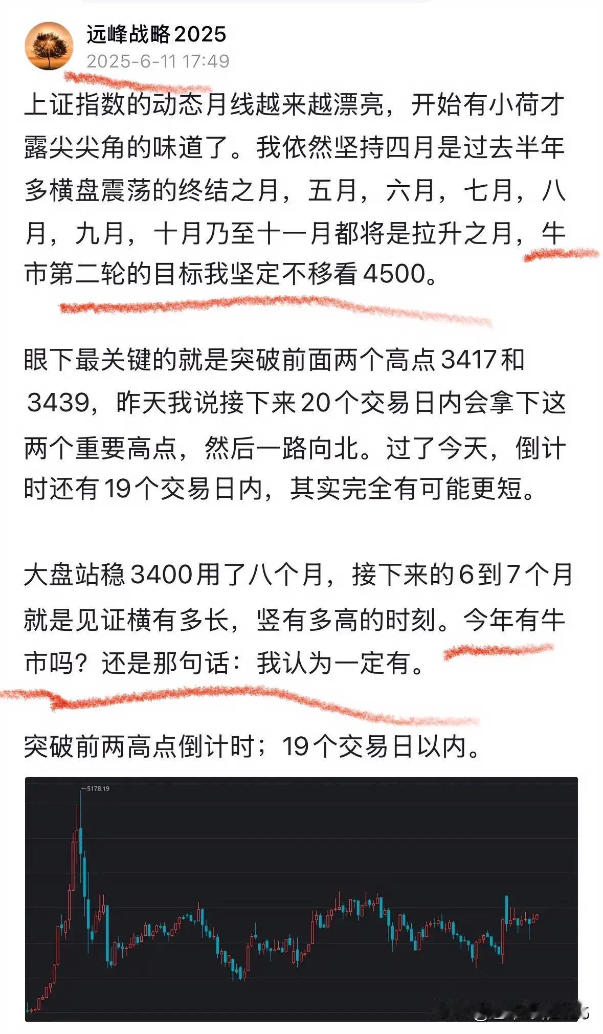 十月份的月线在我看来依旧会是阳线,收阴线的概率很小很小,几乎可以约等于0。在今年四月初的时候我说过,四月份的低点将是全年的低点,后面的五月,六月,七月,八月,九月,十月,乃至十一月都将是拉升的月份,目标直指4500. 现在前面五个月的月线已经被验证的确是拉升的,十月份,我认为也不会例外,月线依旧会收阳,顺理成章站稳4000点以上,为最后两个月冲击4500点做好充分的准备。不管每天如何走,拉长时间看,其实都是在按照当初设定的剧本向前推进。 距离4000点突围倒计时:还剩12个交易日以内。