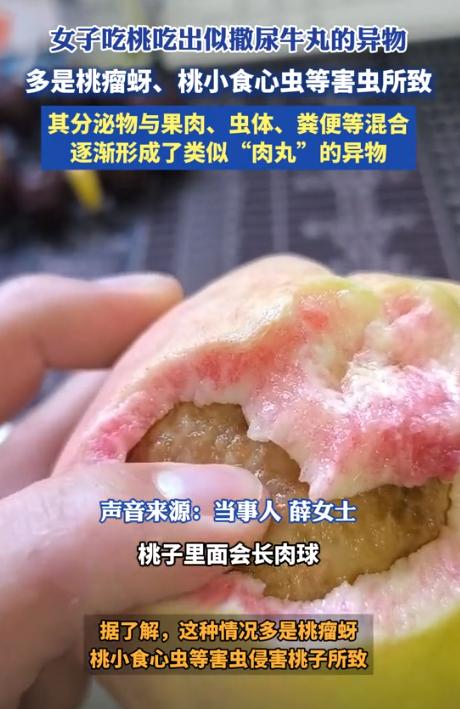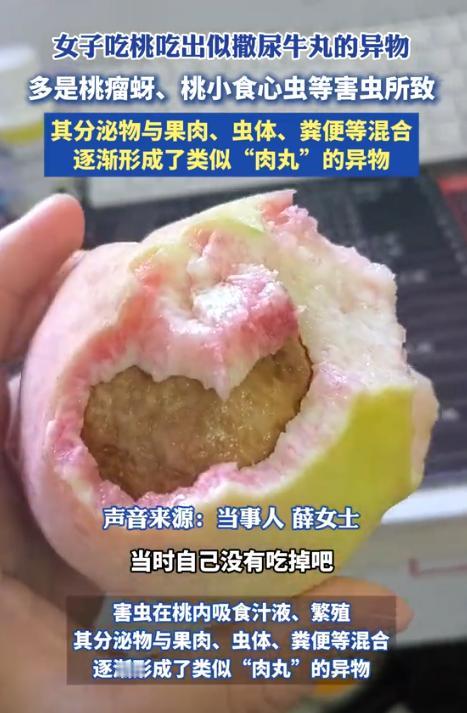 “活久见!”近日,山东临沂,一女子在家里吃桃时,竟意外发现桃子里面有一个“肉球”!她本以为是桃子里面长出了一个“撒尿牛丸”,结果却被告知这些都是虫子的粪便和尸体?网友:没想到桃子里也有“肉”啊。 薛女士(化名)那天在家看电视,嘴有点馋,就想着吃个水果解解渴。 她从冰箱里翻出前几天买的桃子,看着颜色挺好,连一点虫眼都没有。 她用水冲了冲,擦干,拿着就往沙发上一靠,边看电视边啃。 刚开始几口味道挺好,桃子汁水多,甜度也正合适,薛女士还忍不住嘀咕:“这桃子挺新鲜的。” 可吃到一半,她忽然感觉嘴里有点不对劲,咬到中间那口时,牙齿碰到了个有点“筋道”的东西,既不像核,也不是果肉的那种软烂感,反倒有点Q弹,还有点沙沙的颗粒感。 她皱了皱眉,心想是不是桃子坏了,赶紧把嘴里的东西全吐到纸上。 凑过去一看,整个人都愣住了。 桃子中间的东西圆鼓鼓的,颜色是褐色的,表面还挺光滑,看着像果冻,摸上去却黏糊糊的。 “这啥玩意儿啊?”她心里直犯嘀咕。 拿起来对着灯看了半天,还真看不出个所以然来。 她下意识地揉了揉手心,觉得那团东西还挺软,指头一压还有点回弹。 家里人听到动静过来一看,也被这“肉球”整懵了。 薛女士还开玩笑说:“不会是新款桃子吧?里面自带果肉丸,这也太特别了。” 那股奇怪的触感还留在舌头上,让她怎么都觉得不舒服。 家里人也没见过,笑她说:“你这桃子怕不是长了个‘撒尿牛丸’。” 薛女士又好奇又害怕,拍了段视频发到网上求助,没想到评论区立刻炸锅。 不少网友看一眼就认出来:“那不是啥肉球,是虫子搞的!” 有人解释得很详细:“里面全是虫子的粪便、尸体和分泌物,被果肉裹住才变成那样。” 后来有懂农业的网友补充说,这多半是“桃小食心虫”或“桃瘤蚜”捣的乱。 这种虫子在桃子还小的时候就钻进果肉里,边吃边拉,排泄物混着果胶,时间一长就凝成团,看起来就像个肉疙瘩,掰开后里面是黑褐色的,味儿还特别冲。 薛女士看完解释,鸡皮疙瘩都起来了。 她赶紧把那桃子扔掉,还连漱了好几次口,心里直犯恶心:“幸好没咬碎,不然真得吐出来。” 后来薛女士拍着胸口跟朋友说:“以后吃桃子再不敢直接啃了,得先切开看看。” 这事传上网后,网友反应各不相同。 有人说:“我也遇到过,外面好好的,里面全是虫子,从那以后再也不敢整口咬。” 也有人打趣:“这算不算隐藏版的‘桃宝’,只是有点辣眼睛。” 还有人直呼:“我正吃桃呢,看完直接不敢咬了。” 其实这种事挺常见。 桃小食心虫那类害虫特别狡猾,幼虫刚孵化就能钻进果肉里,留下的蛀洞很小,表皮还能慢慢愈合,外面一点痕迹都看不出来。 虫子在里面吃、拉、钻,时间一久,果肉就被糟蹋成那样。 不过也别太害怕,只要买桃子时多注意几样,别挑表皮鼓包、发黑或有奇怪小洞的。 闻着要是有股怪味就别买,吃之前最好切开几瓣,看果心附近有没有发黑、变软的地方。这样能避开大多数“暗雷”。 薛女士这次虽然恶心得够呛,但也算给大家提了个醒:水果再新鲜,也得仔细看看。 谁都不想吃着吃着,突然发现嘴里那口“肉”其实是虫子的“杰作”。 对此你怎么看? 信源:农林卫视