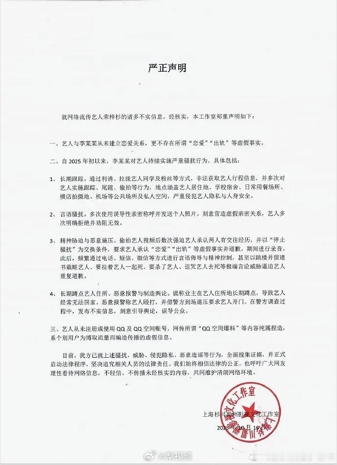 荣梓杉工作室回应: 说荣梓杉都是被逼的,没谈过恋爱,都是问荣梓杉同学粉丝问来的行程,荣梓杉从没用过QQ……