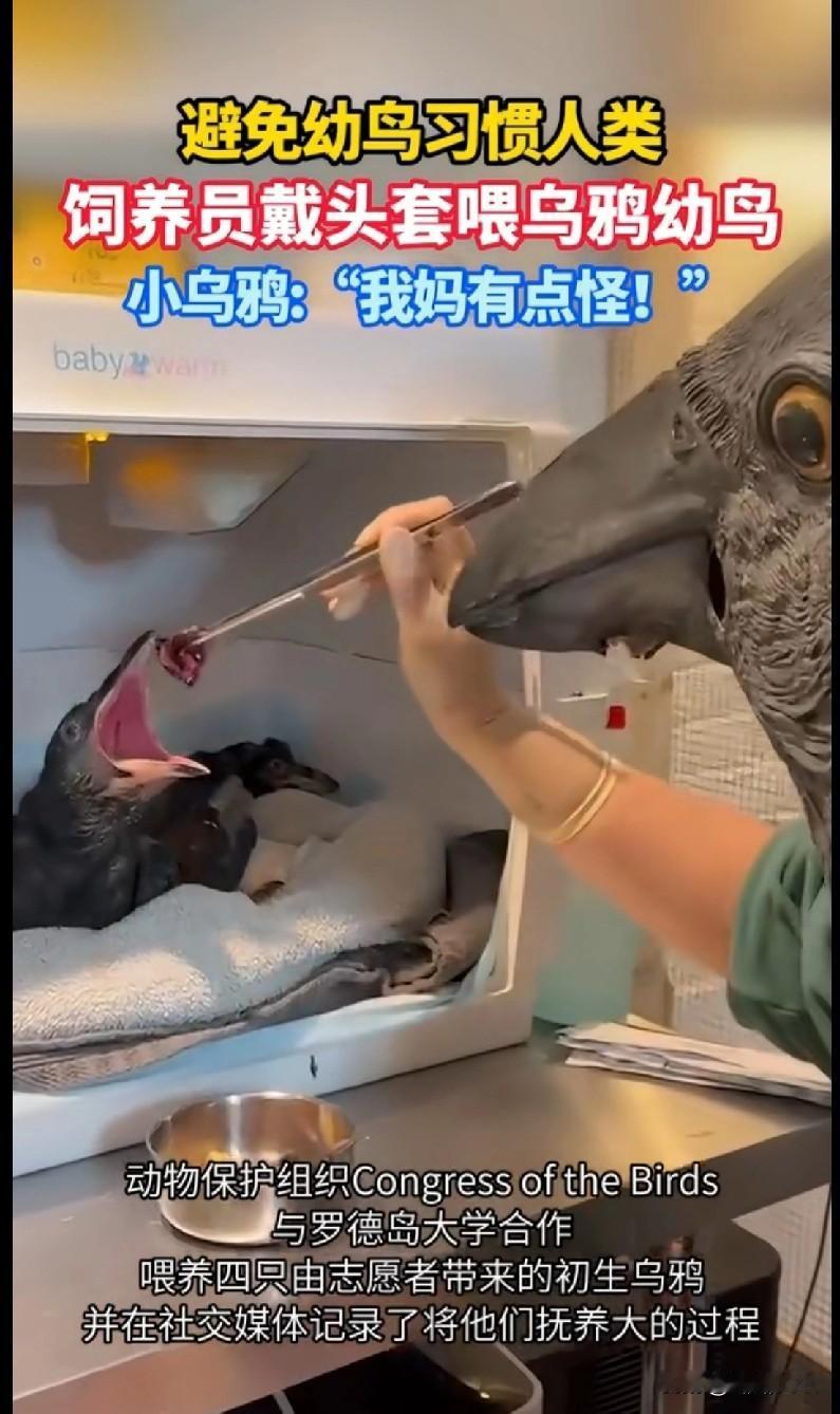 “家人们快来看这波操作!为了不让乌鸦幼鸟习惯人类,饲养员直接戴上乌鸦头套去喂它们,小乌鸦内心OS怕不是‘我妈咋长这样,有点怪但又好像没问题’! 这是动物保护组织和大学合作的项目,专门养四只志愿者送来的初生乌鸦。咱就说饲养员也太拼了,为了让小鸟保持天性,连头套都安排上了,这画面又搞笑又暖心。 你们见过这么奇葩的饲养方式不?不得不说,为了动物好,人类也是想尽了办法。快来说说你们的看法,这波操作你给几分?”