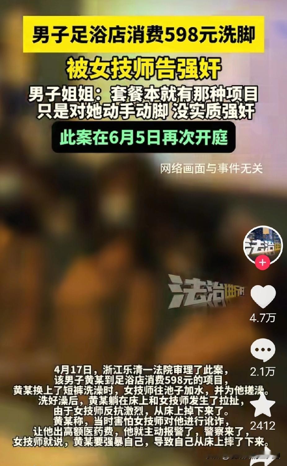 “白嫖成功了?”浙江,一男子花598元按摩,怎料,女技师不慎摔倒在地!男子担心被讹医药费,率先报了警,没想到警方来后,女技师果真“反咬一口”,男子也因此被拘,直到家属赔偿10000元,女技师才出具谅解书! 黄某某躺在看守所的硬板床上,怎么也想不通,那个普通的夜晚会彻底改变他的生活。他记得女技师卢某某摔倒时那声闷响,自己第一时间报警的举动原本图个清白,却在警察到来后,事情走向彻底失控。卢某某流着泪指控他“图谋不轨”,而那个不足十平米的按摩房里,没有监控,只有两张截然不同的说法在空气里碰撞。 主动报警的人反成了犯罪嫌疑人,这个逻辑怪圈让黄某某的姐姐百思不得其解。她为了弟弟四处奔走,最终东拼西凑一万元换来了那张薄薄的谅解书,以为能换来自由,却没想到在法庭上,这纸谅解书反而成了让人心里咯噔一下的证据——法官觉得,赔钱太快太主动,是不是心里有鬼的一种暗示? 而另一边,辩方律师拿出了一段暗访视频,显示同一家店的其他技师曾暗示598元的套餐“别有洞天”,试图说明这更像是一场特殊服务价格没谈拢引发的纠纷,而非单方面的暴力侵害。 这场罗生门牵扯出的,远不止一桩悬案。那间没有摄像头的包间,就像整个事件的一个缩影。店家或许是为了客人隐私,或许另有考量,可一旦出事,真相就只剩下两张嘴。有个保洁阿姨曾偷偷告诉黄某某的姐姐,那房间的防滑垫边缘早就卷了边,以前也差点绊倒过人,可她不愿也不敢出面作证。缺了的监控,沉默的证人,让事实变得像掉进井里的一根针,难捞又扎心。 598元的价格标签也成了舆论焦点。什么洗脚按摩要小六百块?网友们的调侃背后,是对这个行业灰色地带心照不宣的猜测。行业数据也显示,浙江足浴行业的纠纷里,超过六成都和这些“说不清道明的服务内容”有关。价格本身成了谜题的一部分,让整个事件在有些人看来,更像是一场交易意外谈崩后的各执一词。 黄某某的案子至今悬着,二次开庭的结果谁也说不准。它像一面镜子,照出封闭空间里信任的脆弱——主动报警不一定是护身符,也可能变成烫手山芋;快速赔偿想息事宁人,反而可能被解读为理亏的证据。它留给我们的思考,早已超出了案件本身。下次遇到类似情况,是报警还是悄悄走开?在真相只有一个却无人见证的房间里,我们到底该相信谁? 各位读者你们怎么看?欢迎在评论区讨论。