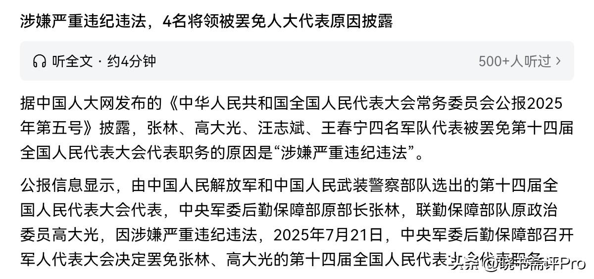 骇人听闻!四位将军被拿下,相关内情被曝光了!10月16日,根据国内媒体,此前被被罢免第十四届全国人民代表大会代表职务的张林、高大光、汪志斌、王春宁的罢免原因曝光了。而目前我们国家给这四个人的定性就是涉嫌严重违纪违法。说实话,一次性拿下一个上将(王春宁),三个中将,可见我们国家反腐决心之大。 这样的举动说明什么呢?这说明我们国家军内大反腐仍在继续向前推进,这些人不管职务有多高,过去做出过什么样的贡献,只要其涉嫌违法犯罪,我们国家就会毫不犹豫的将其拿下。很显然,我们国家对于腐败就是零容忍,对于军内反腐更是在进行重拳整治。 不出意外,这四个人被罢免人大代表资格之后,接下来等待这四个人的命运就是接受审判,接受党纪国法军规的严惩。事实上,最近一两年来,我们军方刀刃向内的反腐力度之大,前所未有。这样的举动,这充分说明,我们国家非常清楚,在面临复杂内外挑战时,打造一支纪律严明,能打胜仗的铁军是我们面对一切挑战的底色。 只有军队作风优良,有战斗力,我们才能更好的捍卫国家利益,才能更好的保护人民群众的生命财产安全。这四个落马丝毫不值得同情,其完全是自作自受。很显然,有了这样的重拳出击,解放军作风会更好,在人民群众心目中的形象会更佳,这样的举动,我们老百姓当然也会拥护。