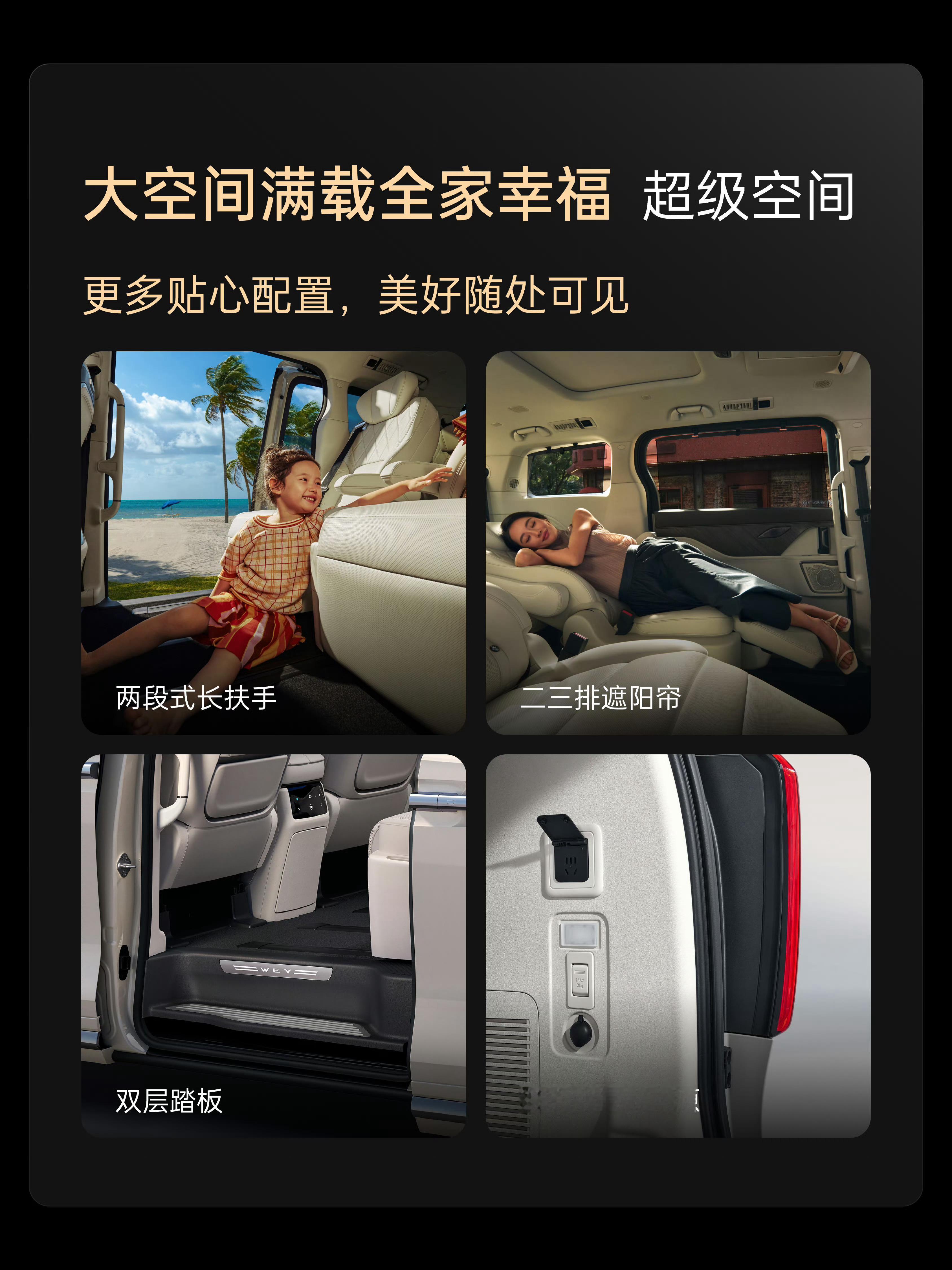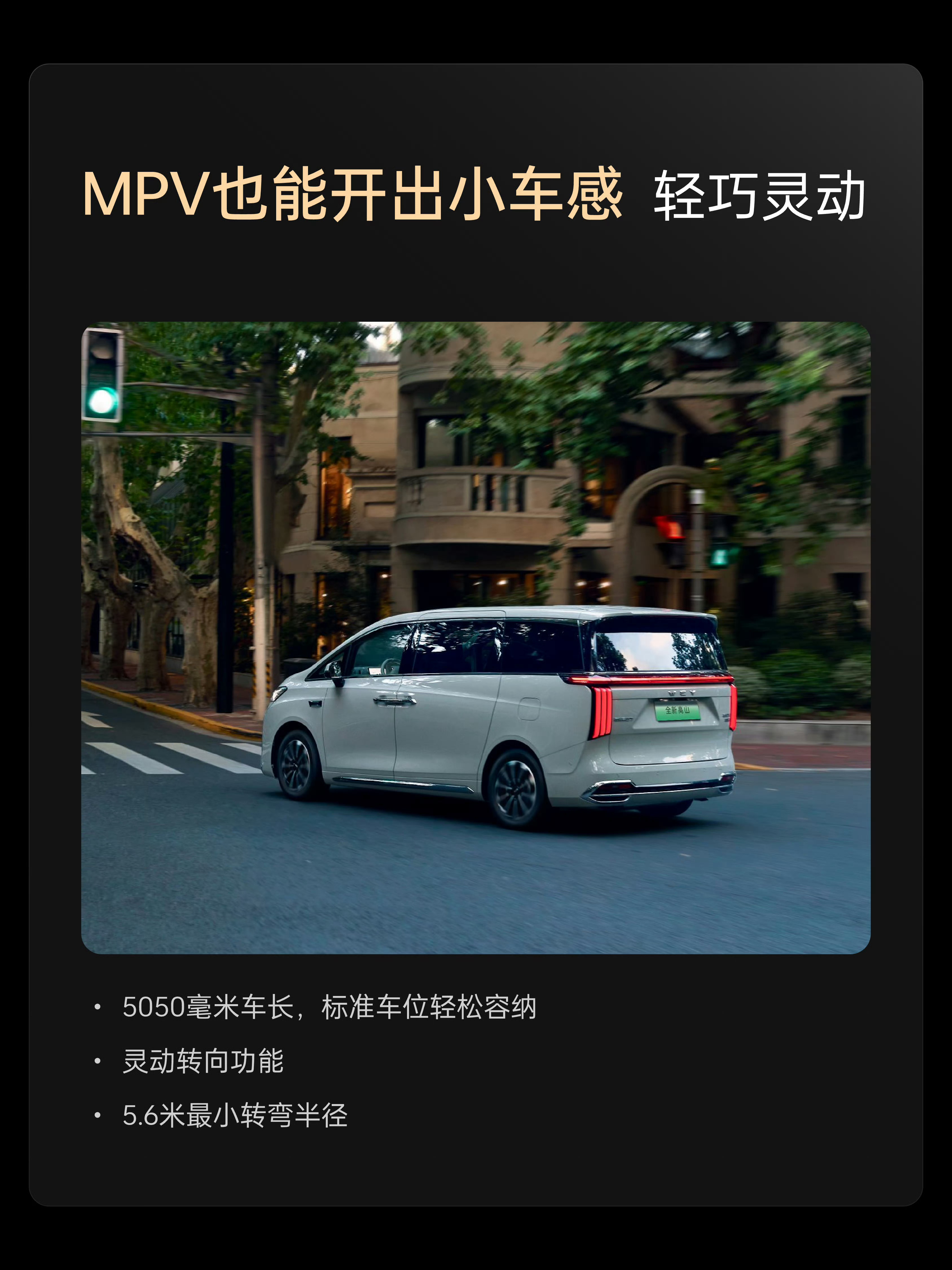 5米出头的车长搭配5.6米最小转弯半径,小区掉头、商场停车都灵活,更绝的是空间利用率,61.1%的得房率,三排都能舒服坐人,动力和智能配置也没缩水,Hi4智能四驱电混系统,零百加速5.7秒,纯电续航172公里,日常通勤不用油,长途续航超900公里。标配激光雷达,高速和城市NOA都能用,泊车成功率高达95%。再加上通风加热座椅、12.5L车载冰箱,全家出行又舒服又安心,30万以内家庭MPV天花板了吧[doge]