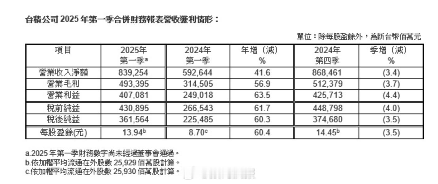 今年第一季度,台积电营收8392.54亿新台币;净利润3616亿元新台币,毛利率58.8%