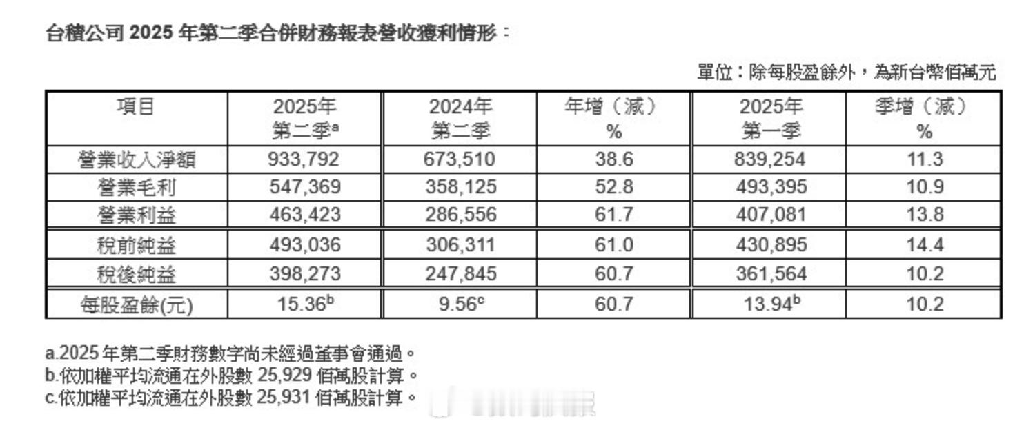 今年第二季度,台积电营收9337.92亿新台币,净利润近3983亿新台币,毛利率58.6%