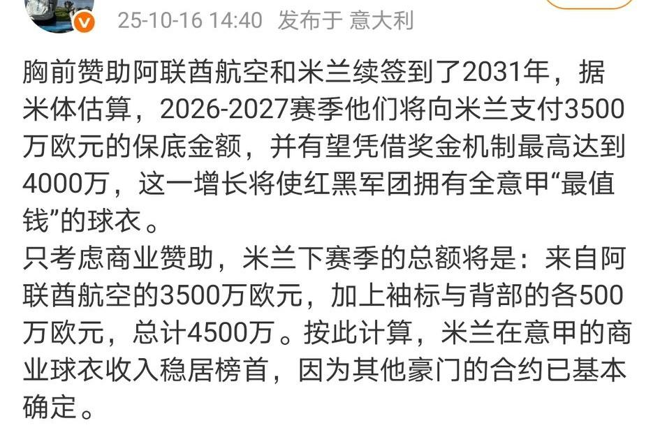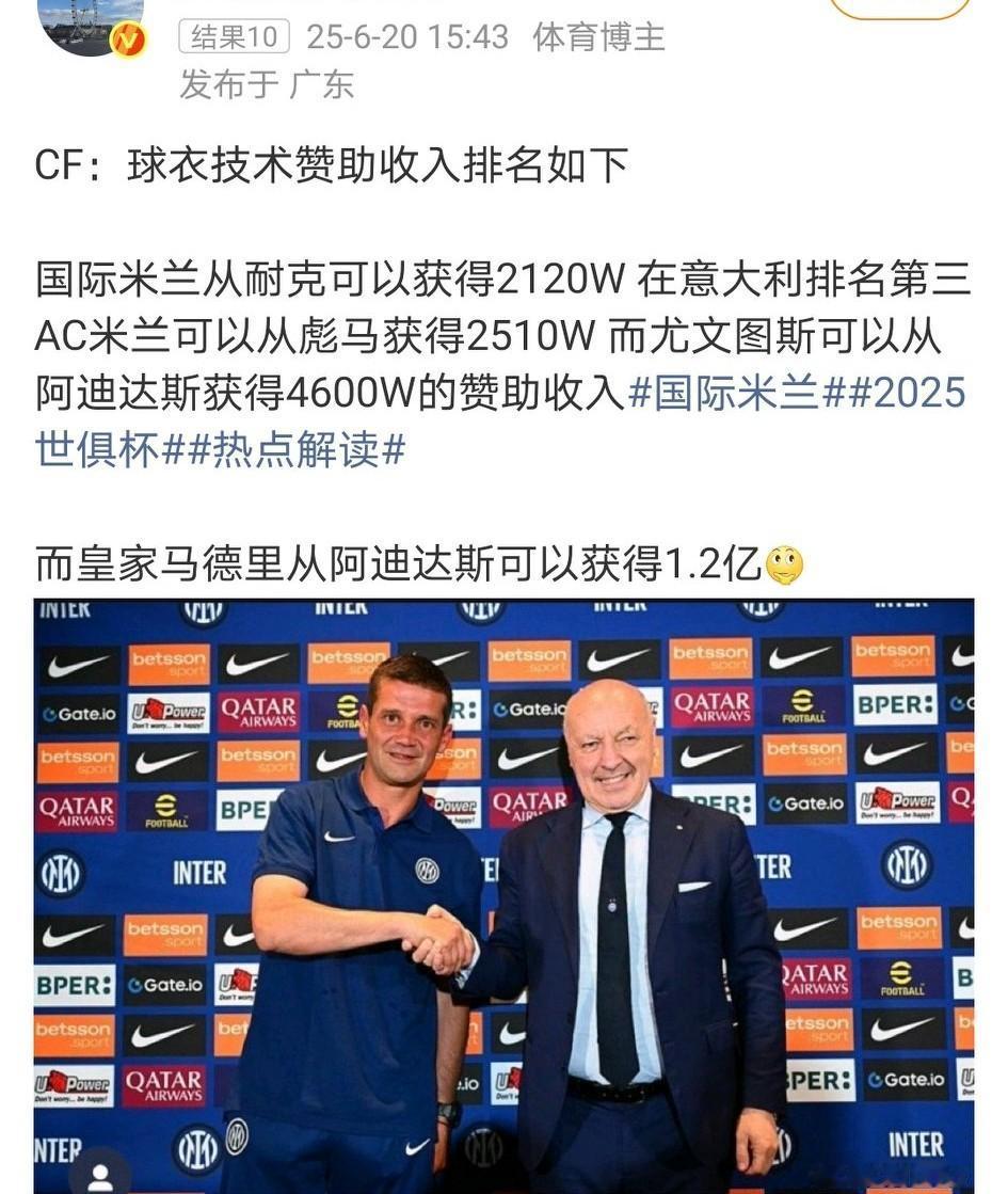 豪门收入的差距还是挺大的!阿联酋航空赞助给米兰就高达4500万欧元!而国米稍差,看看国米最新商业赞助: 比亚迪300万欧元一年,签约3年;海信续约3年;倍耐力。 球衣赞助:6120万欧元 博彩公司Betsson,年费3000万欧元(胸前广告)。 袖口赞助:加密货币平台Gate.io,年费600万欧元。 背部赞助:运动品牌U-Power,年费500万欧元。 技术赞助:耐克(Nike),年收入2120万欧元,排名意甲第三。