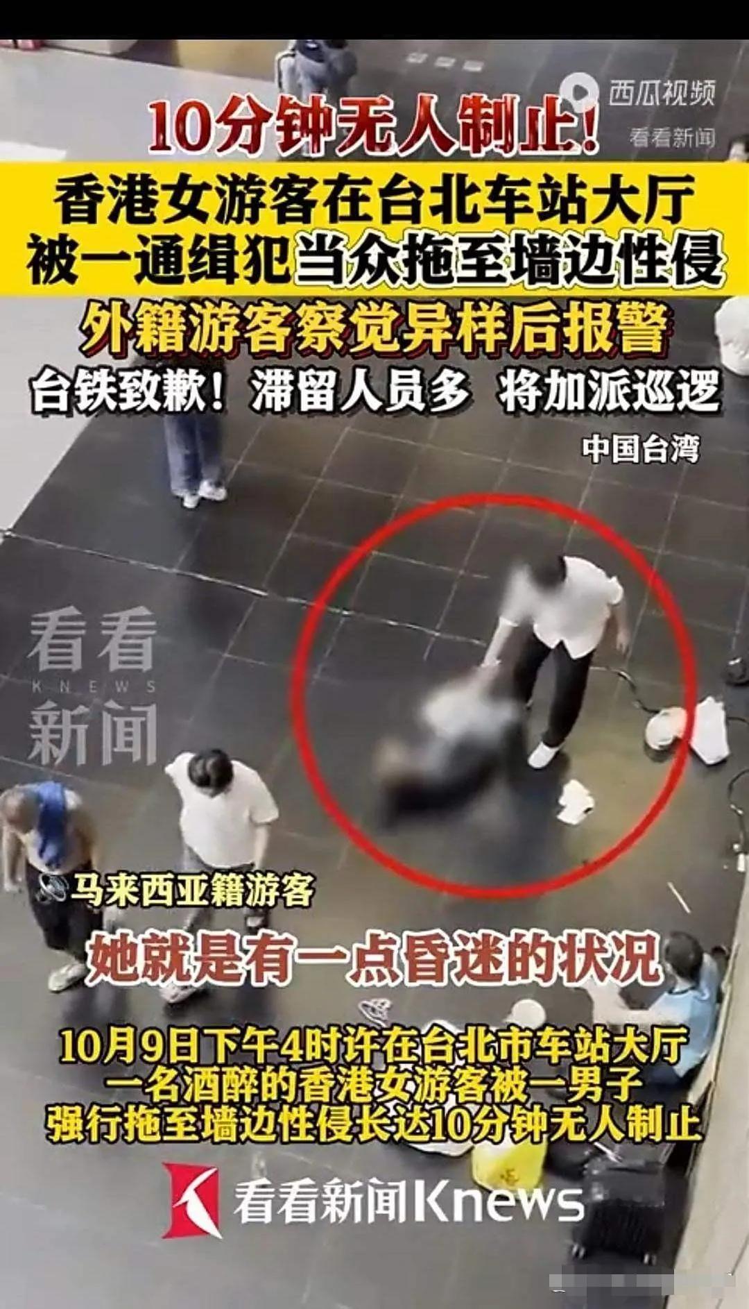 台北车站10分钟公开性侵:当冷漠成为现场“默认观众” 下午4点的台北车站大厅,人流穿梭却寂静得可怕。 一名香港女游客醉酒后瘫坐在角落,监控里的邱姓男子像打量猎物般绕了两圈,见周围人都埋首手机,竟直接将女子拖向墙边。接下来的10分钟里,公开性侵在众目睽睽下发生,路过的行人、坐着的旅客,没有一个人停下脚步,更没人掏出手机报警。 最终打破沉默的,是二楼一名马来西亚学生。他对着楼下拍摄取证,直到朋友赶来才一起报警——而此时,暴行已持续近刻钟。更讽刺的是,警方调查后发现,嫌犯邱某本就是盗窃案通缉犯,却能在人流密集的车站里毫无顾忌地作案。 这不是台北近期唯一的治安惊魂。就在事发5天后,松山区三民路,一名倒垃圾的女子被流浪汉拉扯,对方裤子已脱至膝盖,若非路过的女骑手果断停车阻拦,后果不堪设想。 有网友尖锐发问:“台北的治安现在和印度有什么区别?”当公共场所的巡逻流于形式,当路人的冷漠成为“安全隐患”,比犯罪更可怕的,是整个环境对恶行的默许。 要知道,在内地的车站、机场,保安巡逻从未间断,别说公开施暴,就连形迹可疑的人员都会被及时排查。可在台北车站,本应守护安全的力量缺位,让受害者在人群中孤立无援,更让“公共场所”成了恶行的遮羞布。 当冷漠成为现场的“默认观众”,这样的台北,谁还敢安心前往?