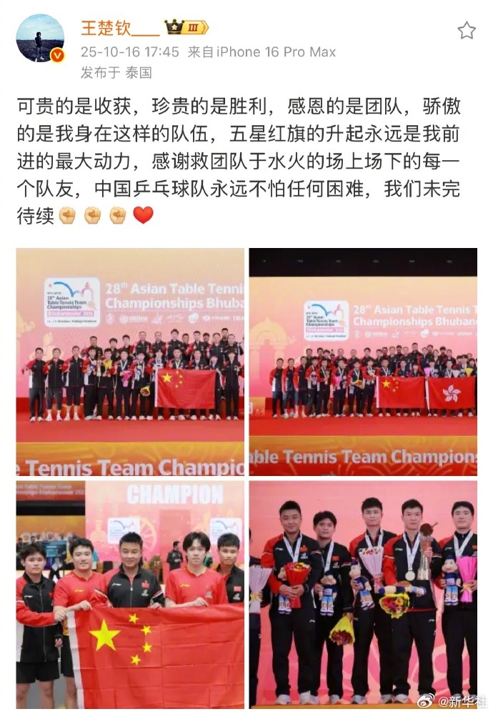 【#王楚钦发博回顾亚锦赛#】#王楚钦说五星红旗是前进动力# 发博:可贵的是收获,珍贵的是胜利,感恩的是团队,骄傲的是我身在这样的队伍,五星红旗的升起永远是我前进的最大动力,感谢救团队于水火的场上场下的每一个人,中国乒乓球队永远不怕任何困难,我们未完待续 [拳头][拳头][拳头][心]
