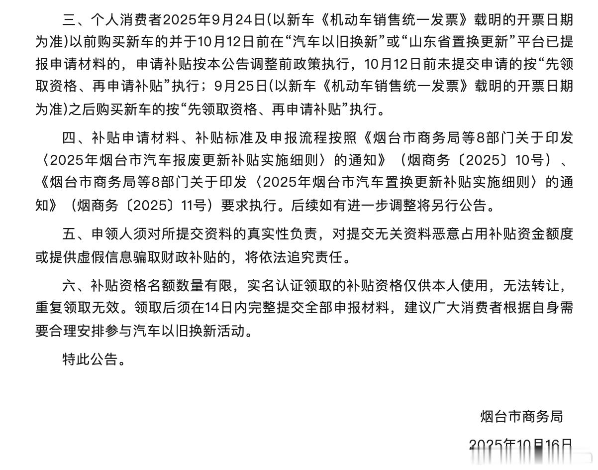 烟台新一轮的以旧换新政策来了,包含置换补贴和报废补贴