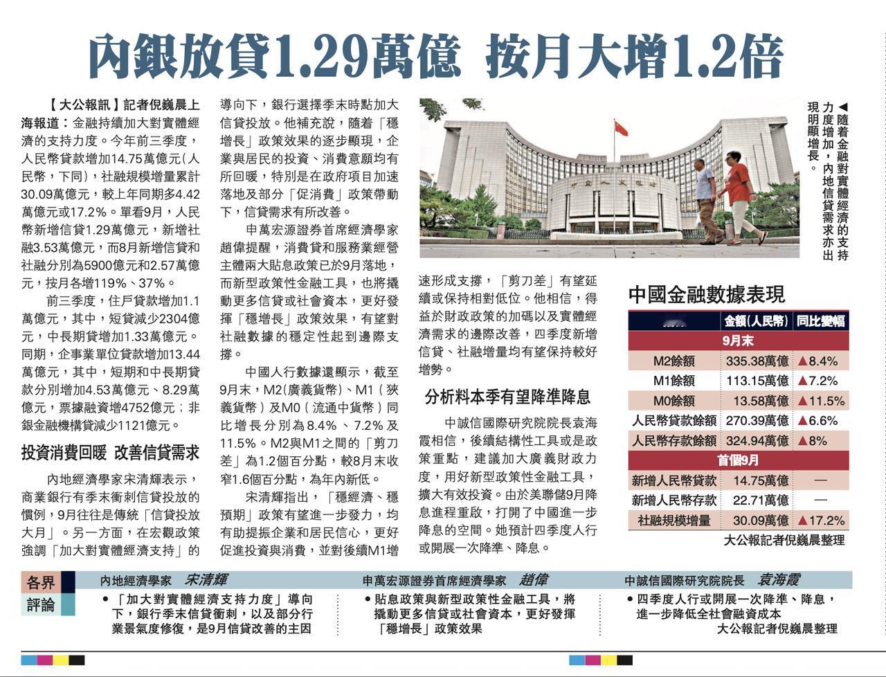 内银放贷1.29万亿,按月大增1.2倍。大公报讯:金融持续加大对实体经济的支持力度。今年前三季度,人民币贷款增加14.75万亿元(人民币,下同),社融规模增量累计30.09万亿元,较上年同期多4.42万亿元或17.2%。单看9月,人民币新增信贷1.29万亿元,新增社融3.53万亿元,而8月新增信贷和社融分别为5900亿元和2.57万亿元,按月各增119%、37%。 前三季度,住户贷款增加1.1万亿元,其中,短贷减少2304亿元,中长期贷增加1.33万亿元。同期,企事业单位贷款增加13.44万亿元,其中,短期和中长期贷款分别增加4.53万亿元、8.29万亿元,票据融资增4752亿元;非银金融机构贷减少1121亿元。 内地经济学家宋清辉表示,商业银行有季末冲刺信贷投放的惯例,9月往往是传统“信贷投放大月”。另一方面,在宏观政策强调“加大对实体经济支持”的导向下,银行选择季末时点加大信贷投放。他补充说,随着“稳增长”政策效果的逐步显现,企业与居民的投资、消费意愿均有所回暖,特别是在政府项目加速落地及部分“促消费”政策带动下,信贷需求有所改善。 中国人行数据还显示,截至9月末,M2(广义货币)、M1(狭义货币)及M0(流通中货币)同比增长分别为8.4%、7.2%及11.5%。M2与M1之间的“剪刀差”为1.2个百分点,较8月末收窄1.6个百分点,为年内新低。 宋清辉指出,“稳经济、稳预期”政策有望进一步发力,均有助提振企业和居民信心,更好促进投资与消费,并对后续M1增速形成支撑,“剪刀差”有望延续或保持相对低位。他相信,得益于财政政策的加码以及实体经济需求的边际改善,四季度新增信贷、社融增量均有望保持较好增势。