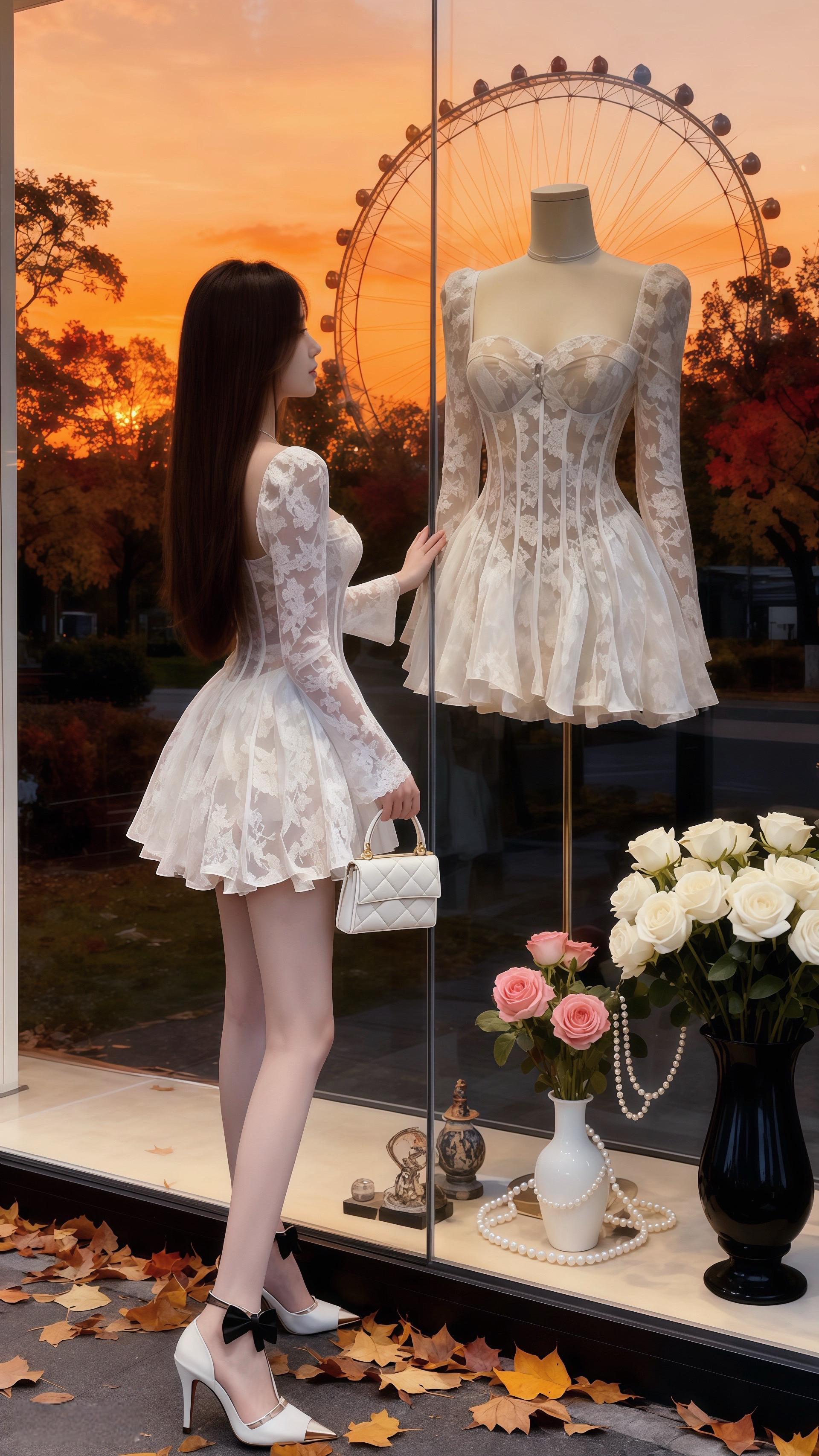 《黄昏摩天轮下的纯白浪漫:她在橱窗前邂逅精致自我》 深秋的黄昏,林薇...