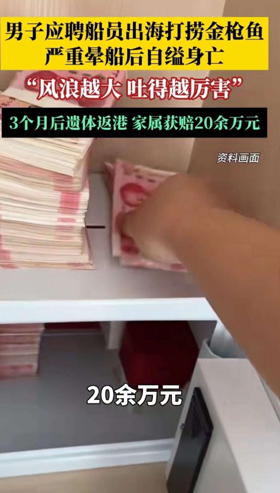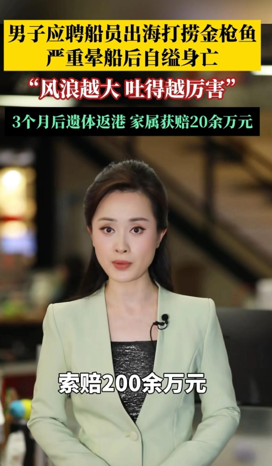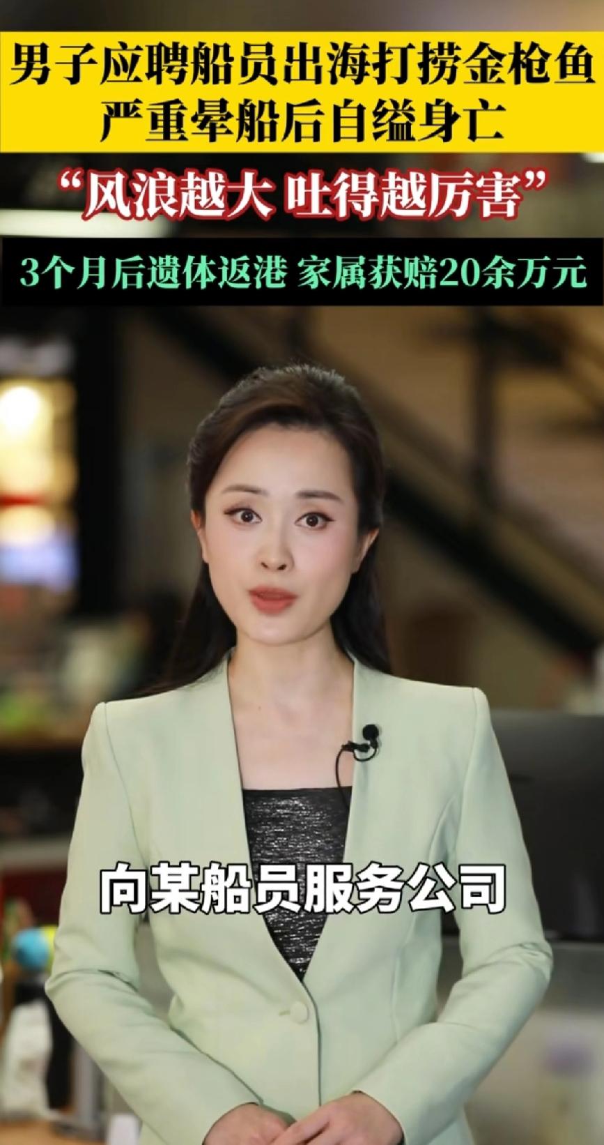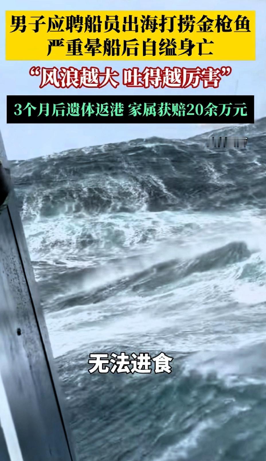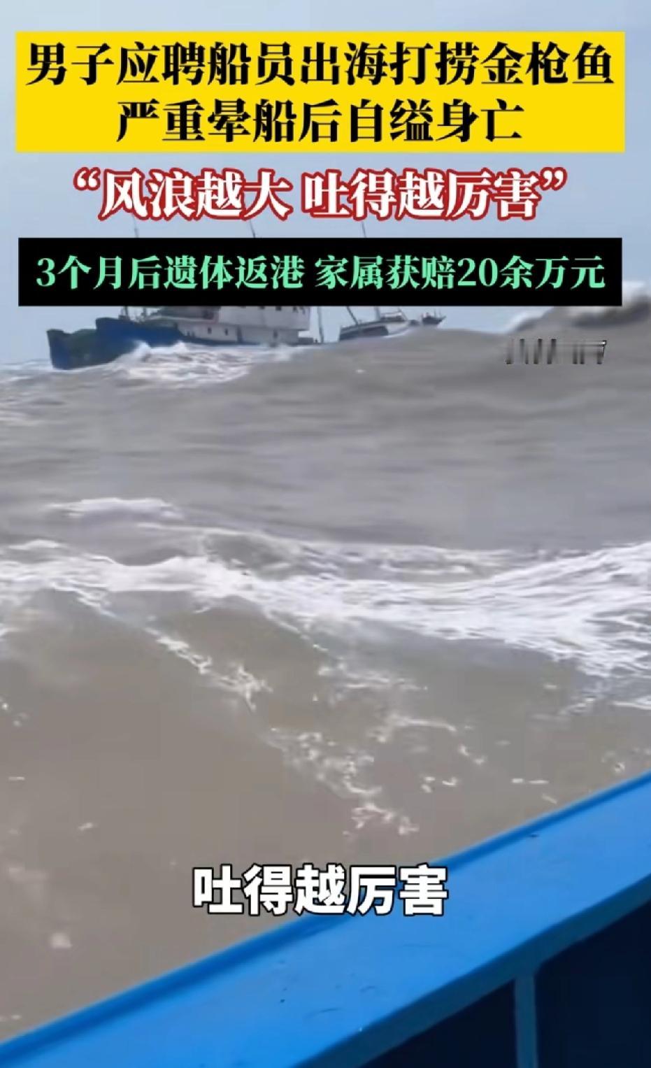 男子应聘船员出海打捞金枪鱼,严重晕船后自缢身亡!风浪越大吐的越厉害! 因无法进食,长期晕船症状没有得到改善!最后王某选择自我了解生命! 1980 年出生的王某,2023 年应聘去公海渔船打捞金枪鱼,没想到出海后严重晕船。同船船员说他吃不下东西,一吃就吐,连胆水都吐出来了,身体状态差到极点。 最终,他在太平洋库克海域的船舱内自缢身亡,3 个月后遗体才返港。 本想去挣钱,结果把命搭进去了!其实还是要选择合适自己的工作! 事后,远洋渔业公司赔了家属 20 余万元,可家属觉得少,索赔 200 多万,结果被法院驳回。 这种赔偿不知道是否合理?20多万确实不多,不过还是听从法律的判决! 或许王某是为了挣钱才去当船员,没想到晕船这么严重,适应不了。 在海上,生命真的太脆弱了,希望大家择业时多考虑自身情况,也希望悲剧不再发生