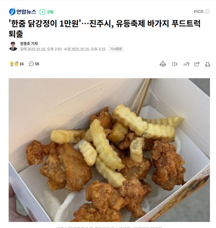 近期,在社交媒体上,一篇关于在晋州南江流灯节上以1万韩元购买了分量极少的炸鸡块的帖子广泛传播,引发了争议。