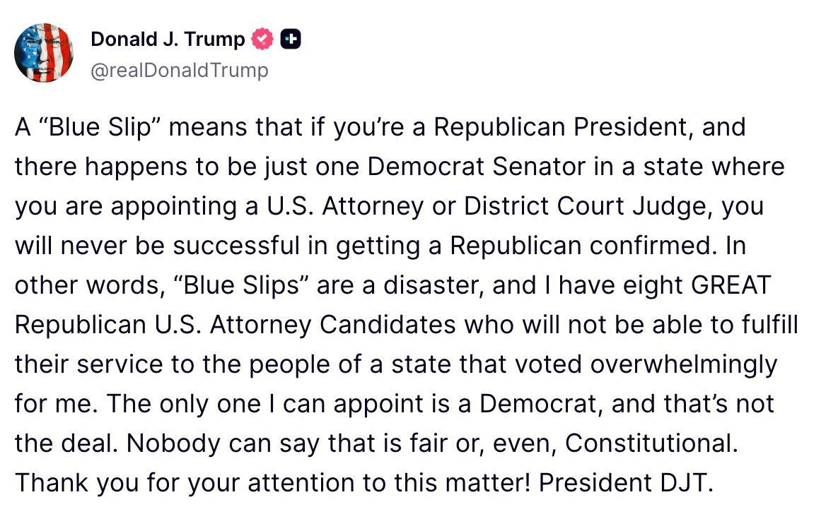 🚨🇺🇸特朗普:“蓝色单子”意味着一名民主党参议员可以阻止一切 “‘蓝色单子’意味着,如果你是共和党总统,而你任命美国检察官或地方法院法官的州恰好只有一名民主党参议员,那么你永远不会得到共和党人的确认。 “蓝色单据”是一场灾难。 我有八位优秀的共和党美国检察官候选人,但由于这个不完善的制度而无法任职。 我唯一能任命的人是民主党人。 没有人可以说这是公平的,甚至是合宪的。 感谢您对此事的关注。” 来源:Truth Social特朗普征加关税 特朗普乱政 特朗普表 特朗普法案 特朗普新禁令 特朗普碰壁 美国共和党
