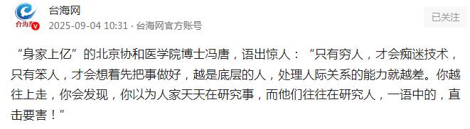 “身家上亿”的北京协和医学院博士冯唐,语出惊人:“只有穷人,才会痴迷技术,只有笨人,才会想着先把事做好,越是底层的人,处理人际关系的能力就越差。你越往上走,你会发现,你以为人家天天在研究事,而他们往往在研究人,一语中的,直击要害!” 这番话刚传开就炸了锅。有人觉得这是戳破现实的真话,有人骂这是给底层贴标签的傲慢言论。 但抛开情绪化的争论,结合他横跨医学、商业、文学的经历,以及近年公开的做事方法,会发现这番话的内核藏着容易被忽略的成事逻辑。 先看冯唐这个人。1998年他从协和医科大学拿到临床医学博士学位,专攻妇科肿瘤,不是凭空否定技术的门外汉。 2000年转行商业后,7年做到麦肯锡全球董事合伙人,后来执掌华润医疗,又成了中信资本负责医疗投资的高级董事总经理。 他自己在2024年接受采访时都说,做医疗投资的底气来自三个积累:医学教育背景、医生人脉资源、九年咨询和五年国企经验。 这些经历里,“把事做好”是基础,他不可能真的觉得做事没用。 那冯唐为何要强调“研究人”比“研究事”更重要?答案藏在他的“金线原理”里。 他在2025年出版的《金线》里说,解决问题的核心是“以假设为驱动,以事实为基础,符合逻辑的真知灼见”,而这套方法落地的关键往往在“人”身上。 2019年罗永浩负债后想靠直播还债,一开始天天研究选品、话术,忙得团团转却没起色。 冯唐介入后,没纠结这些具体操作,而是帮他搭建股权架构,成立公司控股“交个朋友”。 他看透了资本对流量资产的需求,也摸准了罗永浩个人IP的价值,2020年就促成上市公司用近6亿收购股份,让罗永浩三年就还清债务。 这不是否定做事,而是用“研究人”的思维给做事的成果找对了出口。 这种逻辑在他早年职场里早有体现。2003年冯唐刚升为麦肯锡合伙人,接手一个百亿级药企重组案,对方没细看方案就打了预付款。 后来对方说,是查到冯唐带团队给客户省的钱比收费多7倍。这正好对应他在《成事心法》里提的信任公式:信任等于可信度、可靠度、可亲度除以自私度。 可信度来自他的专业功底,可靠度体现在过往成果,可亲度是处事方式,把客户利益放前面降低了自私度,资源自然主动靠拢。 他在华润医疗时,能撬动央企资源推进建院计划,靠的也是这种积累。 不是耍嘴皮子,而是每次项目都比约定时间提前交付,老领导信得过他,才愿意把资源交给他。 冯唐的言论之所以引发争议,问题出在“穷人”“笨人”这些标签上。很多人反驳,底层痴迷技术是因为只能靠手艺谋生,科研人员深耕技术是追求价值,不是笨。 这种反驳有道理,冯唐的表述确实太绝对。但剥离标签看本质,他想讲的是,当发展到一定阶段,做事的价值会遇到瓶颈,而人的因素能打破这个瓶颈。 就像2025年双11,董宇辉的“与辉同行”直播间三天销售额就突破3亿,场观近7000万。这背后既有他多年积累的知识功底,也离不开冯唐早年点拨的“看清位置、未雨绸缪”。 董宇辉成立独立工作室后,没只盯着卖货,而是整合地方文旅资源,读懂了观众要文化体验、地方要推广的需求,这正是“研究人”的体现。 网友的看法很实在。有人说自己是技术骨干,项目总被同事抢走功劳,后来才明白,不是技术不行,是没让领导看到自己的价值,这就是不懂“研究人”的亏。 也有人说,冯唐的逻辑在科研领域不成立,实验室里拿数据说话,搞人际关系没用。这两种观点其实不矛盾。 冯唐帮罗永浩,前提是罗永浩能把直播做好;他自己能跨界,基础是协和博士的功底。“研究人”从来不是替代“做事”,而是给做事的成果安上翅膀。 冯唐在2025年的一次分享里说,《金线》里的方法能解决90%的问题,但得先懂人。这正好呼应了他的核心观点:结构化思维是工具,但用工具的是人。 他当年从华润医疗离职,因为竞业条款淡出医疗行业一年,复出后能快速在中信资本立足,靠的就是之前积累的人脉和信任。 那些觉得他只靠“研究人”的人,没看到他背后十几年的专业积累。 说到底,冯唐的话有片面之处,但也点出了一个现实:光会做事是“老黄牛”,光懂人是“空心草”。能成事的人,都是既扎稳了做事的根,又长好了懂人的枝。 对此你有什么看法,来评论区聊聊。 信息:2025-09-04 10:31·台海网官方账号 “身家上亿”的北京协和医学院博士冯唐,语出惊人:“只有穷人,才会痴迷技术