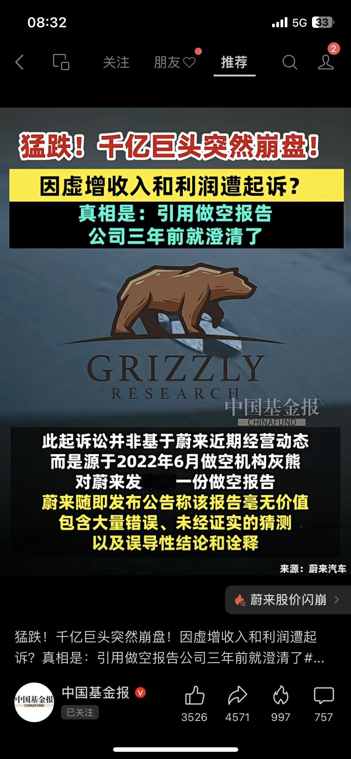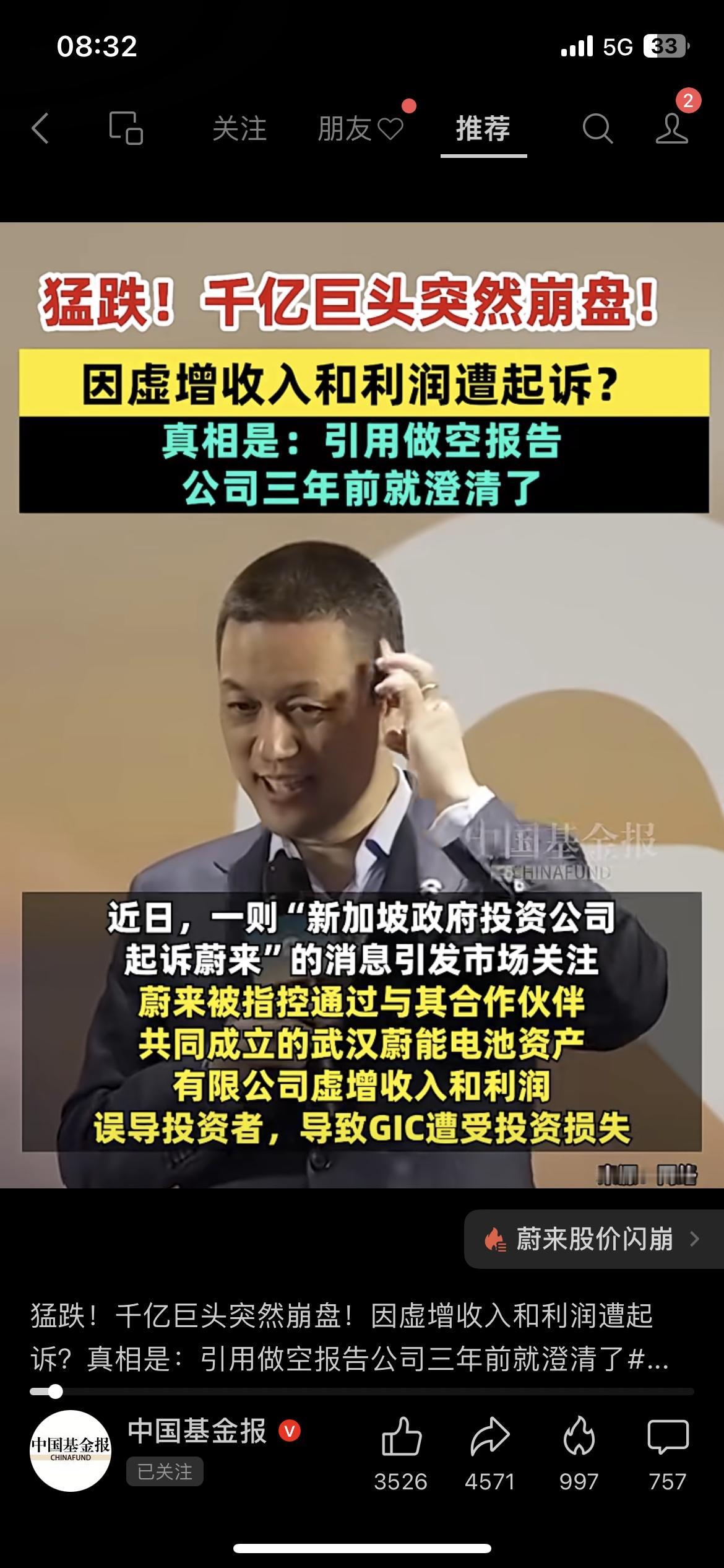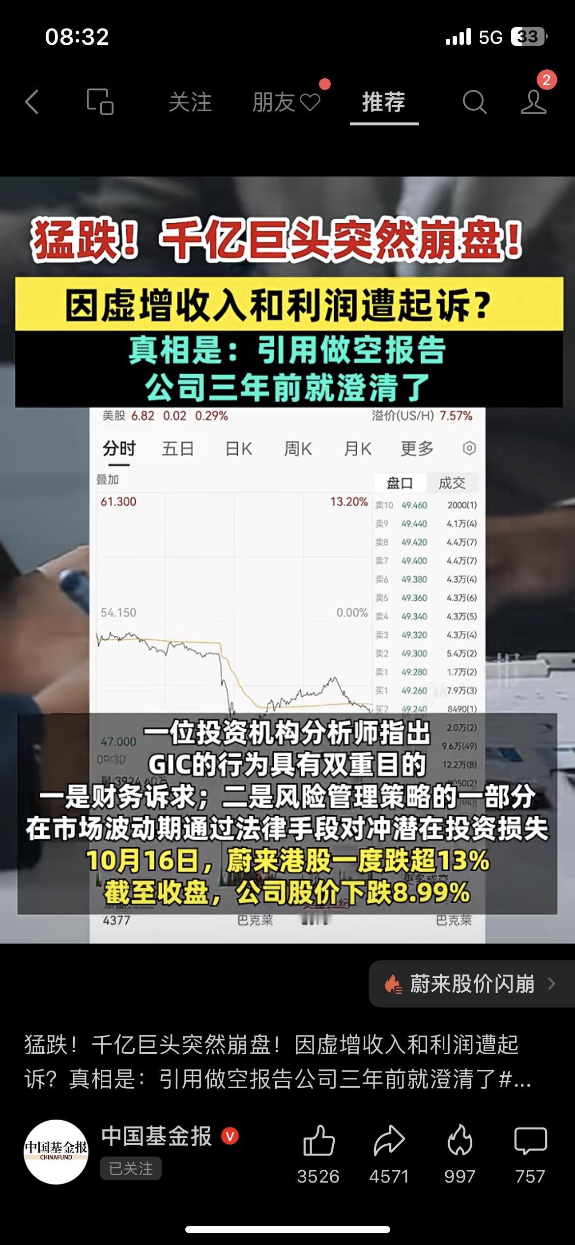 千亿巨头闪崩!蔚来遭起诉虚增收入利润?真相竟是三年前的“旧账”! 突发!10月16日蔚来港股一度暴跌超13%,收盘仍跌8.99%!起因是新加坡政府投资公司GIC起诉蔚来,指控其通过武汉蔚能虚增收入和利润、误导投资者。 但真相反转来得猝不及防:此次诉讼引用的是2022年6月做空机构灰熊的旧报告,蔚来当时就发布公告澄清,称该报告“毫无价值,充满错误和误导性结论”。 有投资机构分析师指出,GIC此举或有双重目的:一是财务诉求,二是借法律手段对冲市场波动期的投资损失。 提醒投资者理性看待:市场信息繁杂,切勿被旧闻炒作带偏节奏!蔚来股价闪崩 资本博弈