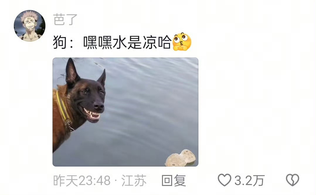狗狗和主人一个天真一个无鞋狗狗非要玩下水捡鞋游戏,主人 warn 水很冷它偏不听,鞋一扔下去,狗:这水凉得我CPU都冻住了!主人:终究是我没鞋穿了😂