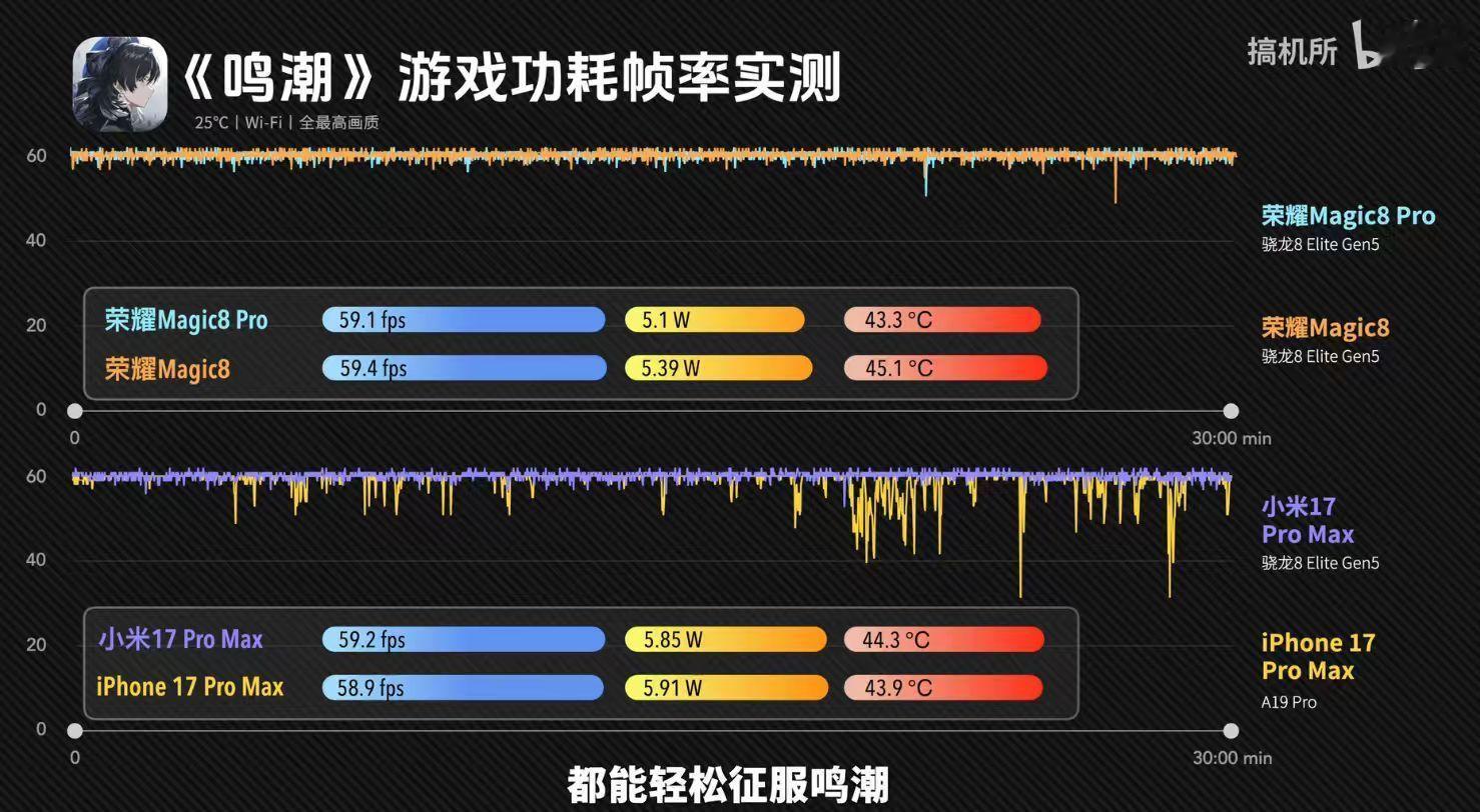 最近新机频出,能打的还是得看荣耀Magic8系列。拿不少人又爱又恨的《原神》来说,最高画质对手机硬件提出诸多考验。荣耀Magic8和Magic8 Pro两款手机,都能够以60帧的稳定帧率流畅运行,一条直线跑满。两款新机在“折磨”手机的《鸣潮》中的表现同样亮眼,平均帧分别是59.1和59.4。能达到这种水平,离不开荣耀在新旗舰上搭配的第五代骁龙8至尊版,固件性能调度相当刚猛。荣耀Magic82025旗舰手机最爆标准版荣耀巅峰旗舰