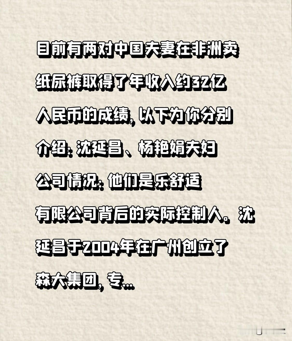 目前有两对中国夫妻在非洲卖纸尿裤取得了年收入约32亿人民币的成绩,以下为你分别介绍: 沈延昌、杨艳娟夫妇 ●公司情况:他们是乐舒适有限公司背后的实际控制人。沈延昌于2004年在广州创立了森大集团,专注于海外贸易。2009年,乐舒适作为内部业务分部开展快消卫生用品业务,2022年独立运营。2025年8月,乐舒适二次递表港交所申请主板上市。招股书披露,以2024年销量计算,乐舒适在非洲的婴儿纸尿裤市场和卫生巾市场均排名第一,市场份额分别为20.3%及15.6%,在加纳、肯尼亚等多个国家的婴儿纸尿裤市场也排名第一。 ●经营业绩:2022 - 2024年,乐舒适收入从约3.20亿美元攀升至4.54亿美元(约合人民币32亿元),年均增长率超过两位数;同期净利润由0.18亿美元跃升至0.951亿美元,增幅超过五倍,净利率也由5.7%增至21.5%。2025年前四个月,公司继续保持良好势头,收入1.61亿美元,同比增长15.5%,净利润0.311亿美元,同比增长12.5%。 黄文章、李晓萍夫妇 ●公司情况:他们创立了纸尿裤品牌“一朵”,以坦桑尼亚为主要起点和基地,业务辐射多个非洲国家,实现了从生产到销售的全链条覆盖。 ●经营业绩:在非洲市场,他们将“一朵”打造成知名品牌,据媒体报道年营收达到32亿人民币(具体财务数据应以公司官方发布为准),占据了当地相当大的市场份额。 ●成功因素: ○发现市场空白:早期非洲纸尿裤市场被国际大牌占据,价格高昂,而低价劣质产品体验差,存在性价比高、质量可靠的纸尿裤市场缺口。同时,非洲年轻的人口结构和高生育率带来海量潜在客户,且随着经济发展和城市化,年轻父母对现代育儿用品接受度和消费意愿提升。 ○本地化策略:产品设计上,针对非洲炎热气候研发更薄、更透气芯体,使用非洲消费者喜爱的鲜艳色彩和本地文化图案;定价精准定位中端市场,推出小包装、单片销售等灵活方式;营销渠道上,构建线下分销网络,与小商店、杂货铺合作,并利用当地音乐、舞蹈等方式宣传。 ○供应链优势:在坦桑尼亚就地建厂,实现“非洲制造”,降低成本、能快速反应市场需求并创造就业。同时背靠中国强大制造业基础和供应链管理经验,高效采购原材料和设备,移植成熟生产管理体系。 ○品牌情感连接:夫妻二人在非洲打拼的创业故事具有感染力,展现出勤奋、坚韧和与当地社区共同发展的形象,易获得消费者信任。