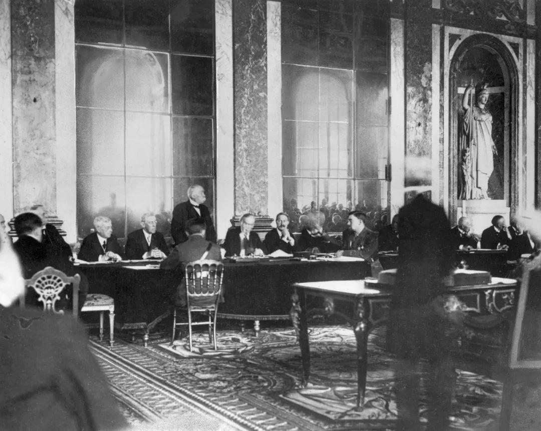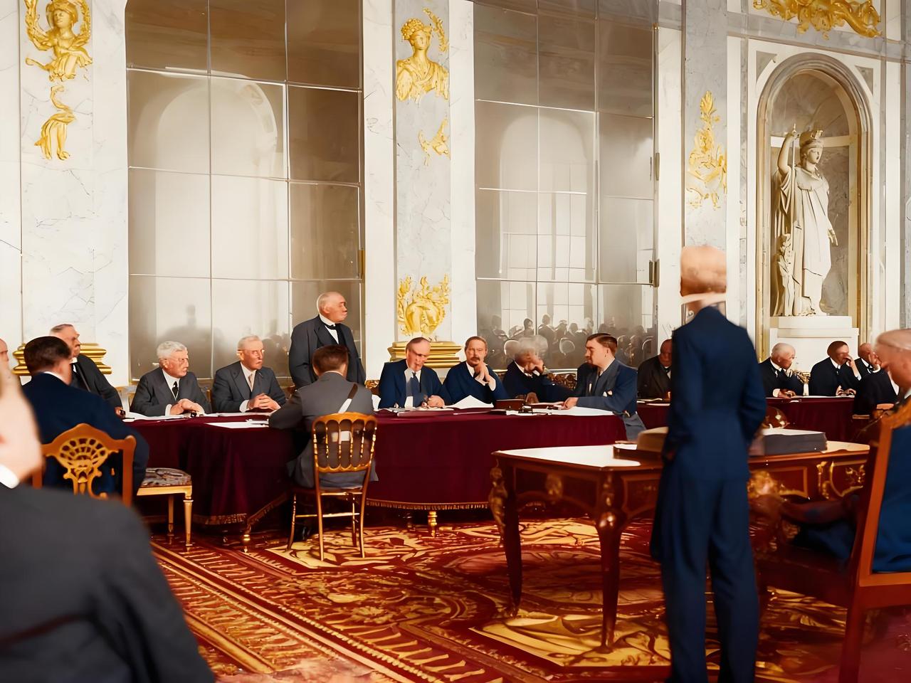 这张照片定格了1919年巴黎和会的核心现场,地点是凡尔赛宫的豪华厅室,处处彰显着帝国主义强权博弈的虚伪与奢华。 这是一场以“和平”为名帝国主义分赃大会。英、法、美等列强代表在奢华表象下,围绕殖民地划分、战争赔款等议题激烈角力,而中国等弱小国家的权益被肆意牺牲(如山东主权被强行转让日本)。