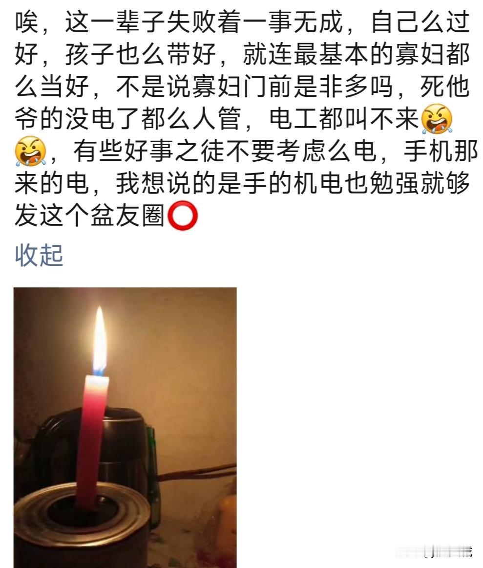 老话不是说寡妇门前是非多嘛? 这年头连寡妇都不好当,这是朋友圈一个寡妇朋友发出的心声,家里没电了都没人管,究竟是这年头的寡妇不好纠缠?还是寡妇不受人待见了? 说起她也可怜,带着两个同母异父的孩子在娘家给她修了房子,由于带着两个男孩子,老大还有点残疾,也没人敢上门打听要她,索性就在娘家门口扎根落户了,这不家里的电线路出问题了,都没人去帮她修一下,她就在朋友圈发牢骚骂人。 究竟是她这个寡妇太难缠了?还是现如今的寡妇不吃香了?